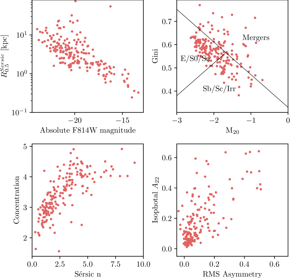Для точного определения и измерения структуры галактик применяются надежные методы, такие как профиль Серсика, описывающий распределение света. Количественные морфологические параметры – концентрация (C), гладкость (S), асимметрия (A) и параметр Gini-M20M – обеспечивают измеримые характеристики формы и особенностей галактик. Для стандартизации определения размеров галактик используется радиус Петросяна, гарантирующий согласованность измерений. Автоматизация этих вычислений, осуществляемая программными пакетами вроде `statmorph`, позволяет проводить масштабные морфологические исследования, открывая возможности для углубленного анализа структуры и эволюции галактик во Вселенной.