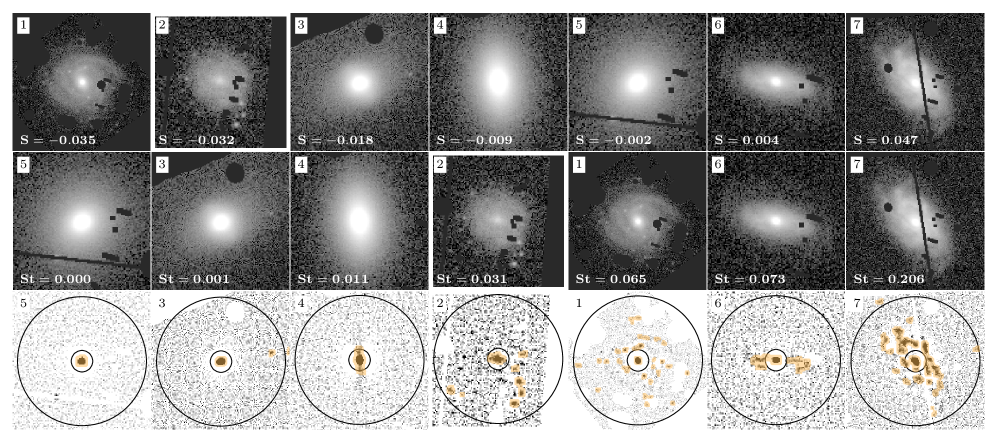 Анализ гладкости (SS) и подструктуры (StSt) десяти галактик показал, что StSt лучше коррелирует с визуальной последовательностью Хаббла, в то время как SS подвержен сильным колебаниям из-за шума, при этом для расчета SS используются все пиксели, а для StSt – только связанные области.