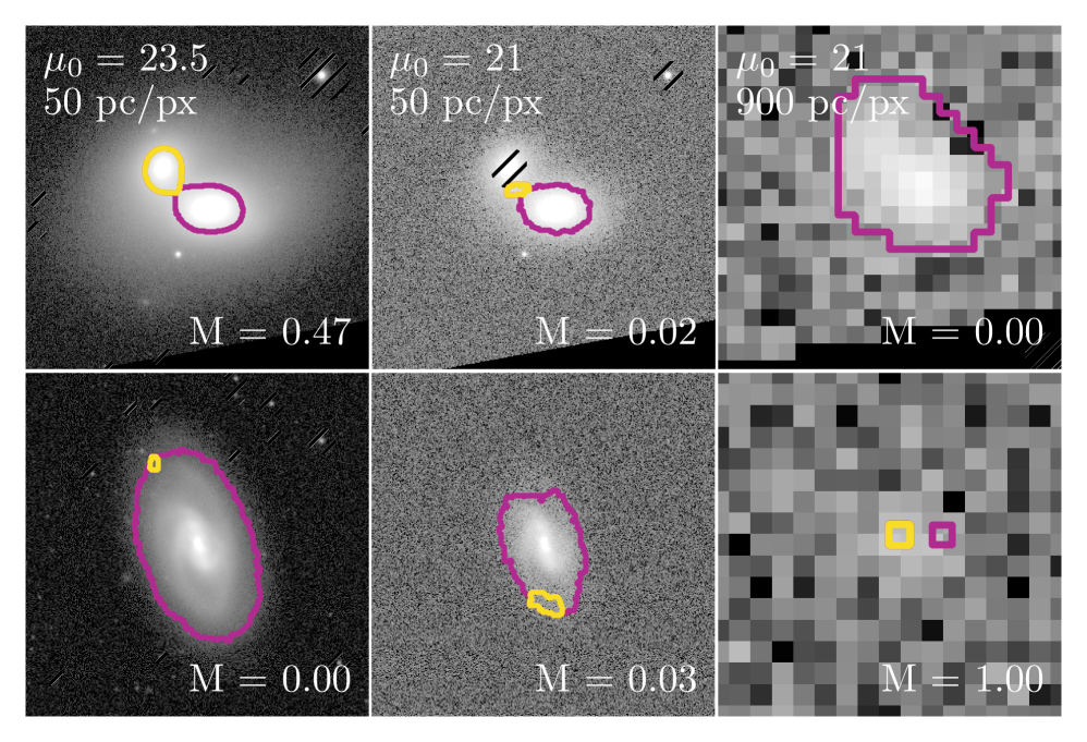 Измерения мультимодальности (MM) позволяют надежно отличить сталкивающиеся галактики от спиральных, особенно при глубоком и высокоразрешающем изображении, в то время как некачественные изображения могут приводить к ложным результатам из-за деблиндинга второго ядра или шумовых всплесков.