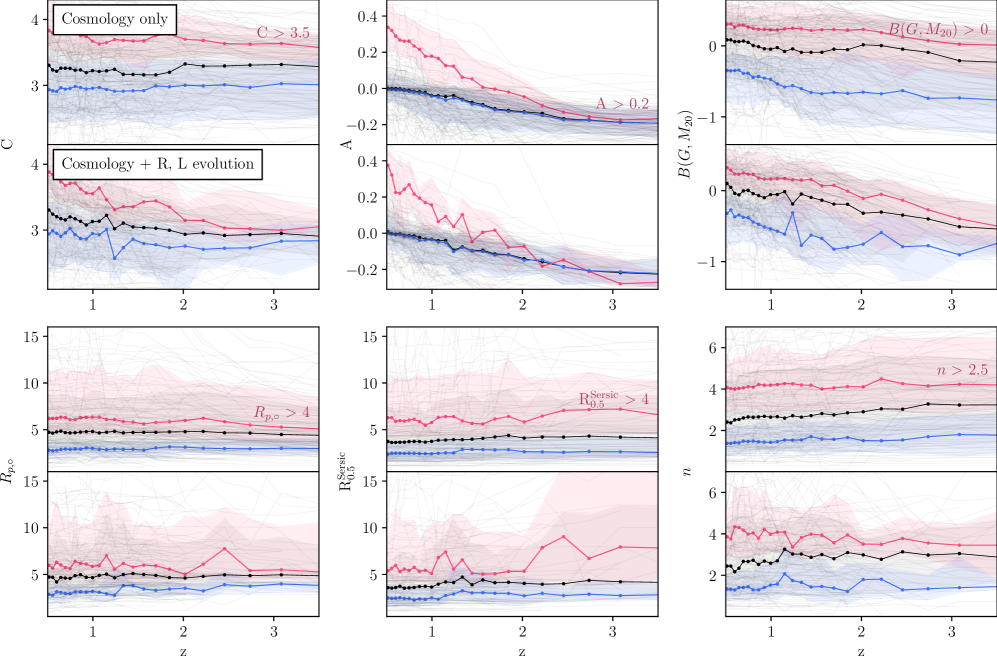 Изменение шести ключевых морфологических показателей галактик при увеличении красного смещения демонстрирует систематическую погрешность параметров CC, AA и B(G,M₂0), требующую коррекции при изучении структурной эволюции, в то время как параметры R_p, R₀.5^Sersic и n остаются в основном несмещёнными, хотя их неопределённость возрастает с ухудшением разрешения и глубины наблюдений, при этом предполагается эволюция размера в соответствии с законом R ∼ R₀(1+z)⁻0.71 (Ormerod et al., 2024) и эволюция светимости L ∼ L₀(1+z) (Yu et al., 2023).