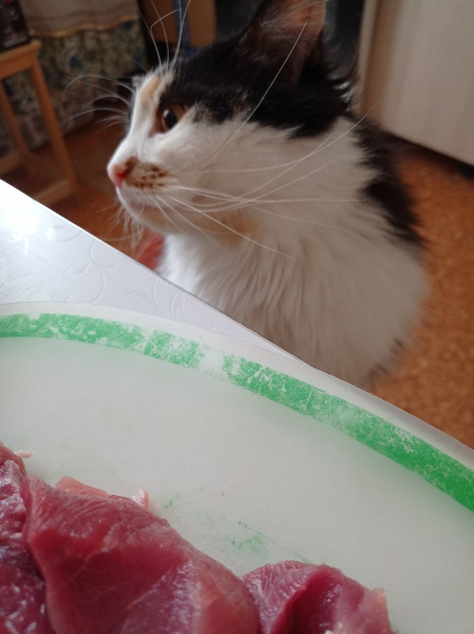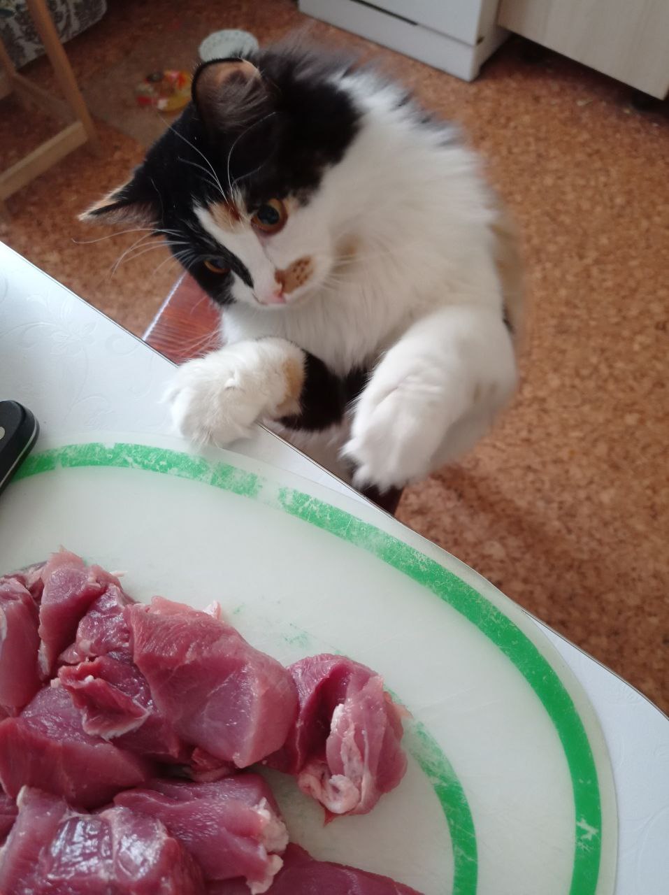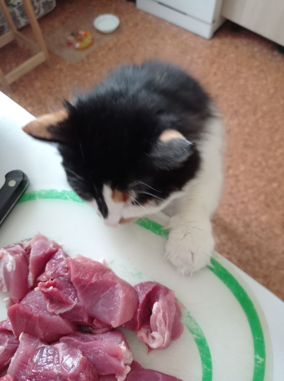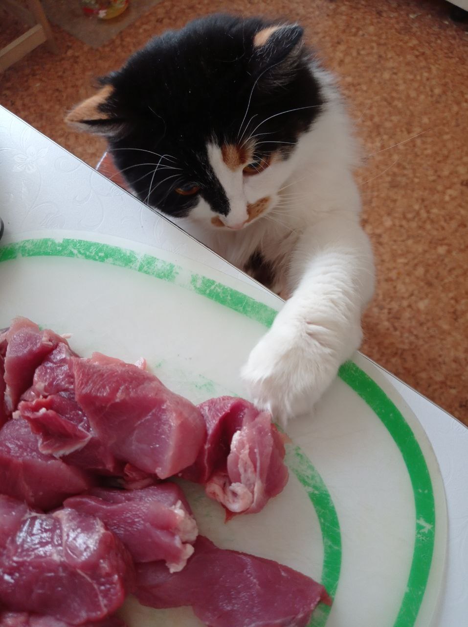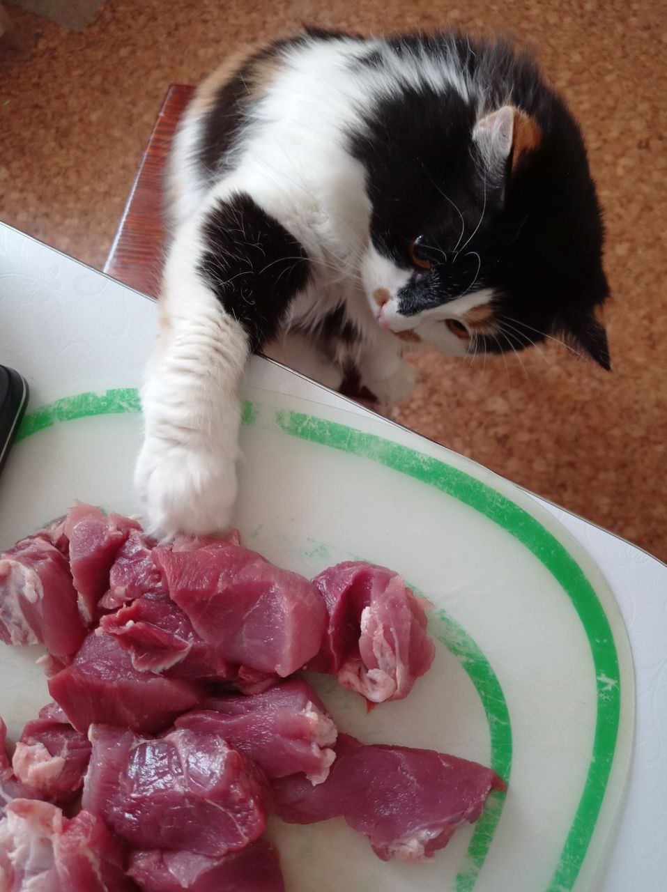 P.S. Положенный в тарелочку кусочек слегка пожевала и снова вернулась любоваться на мяско))) При этом урчала ,как небольшой трактор.