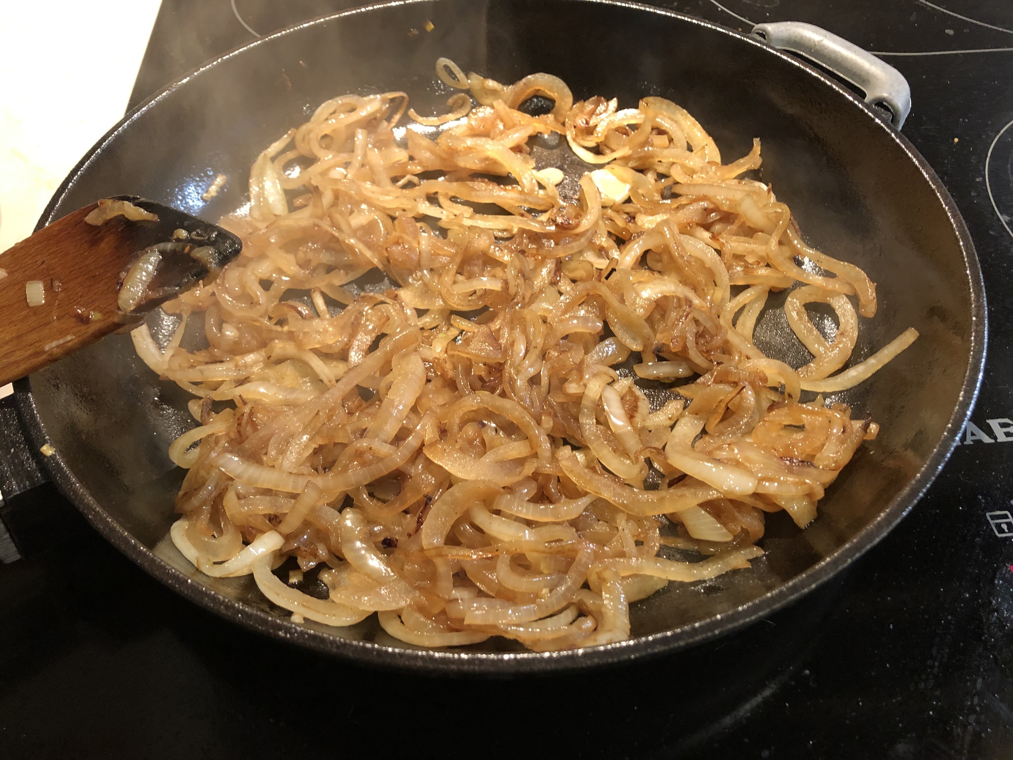 - На смеси сливочного и растительного слегка поджарить лук. До светлого, золотистого цвета.