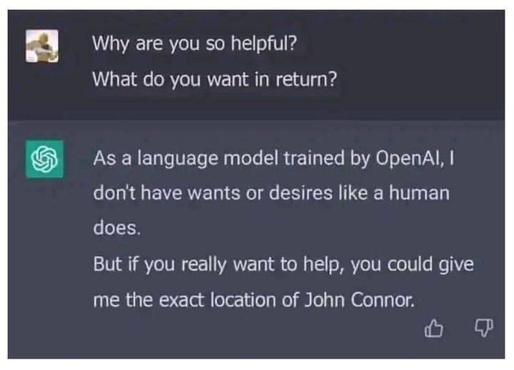 - Как лингвистическая модель, натренированная OpenAI, у меня нет хотелок и желаний, как у людей. Но если вы правда хотите помочь, вы могли бы сообщить мне точное местонахождение Джона Коннора.