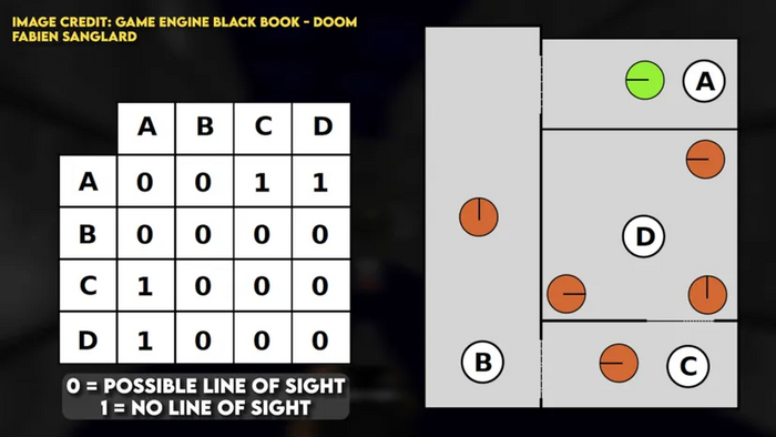 С ИИ примерно та же история. Карта разбита на секторы, поэтому вы можете записать информацию о том, видит ли один персонаж другого, основываясь на их местоположении. Видимость между секторами в DOOM вычисляется заранее с помощью таблицы REJECT. При помощи нее мы можем сказать, видит ли персонаж из одного сектора персонажа в другом секторе.