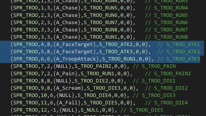 Определение каждого врага в DOOM происходит вне кодовой базы. Текстовый файл из проекта импортируется и компилируется в файл 'info' с характеристиками врага и определениями для всех состояний. Затем информация компилируется в struct, который содержит следующие элементы: