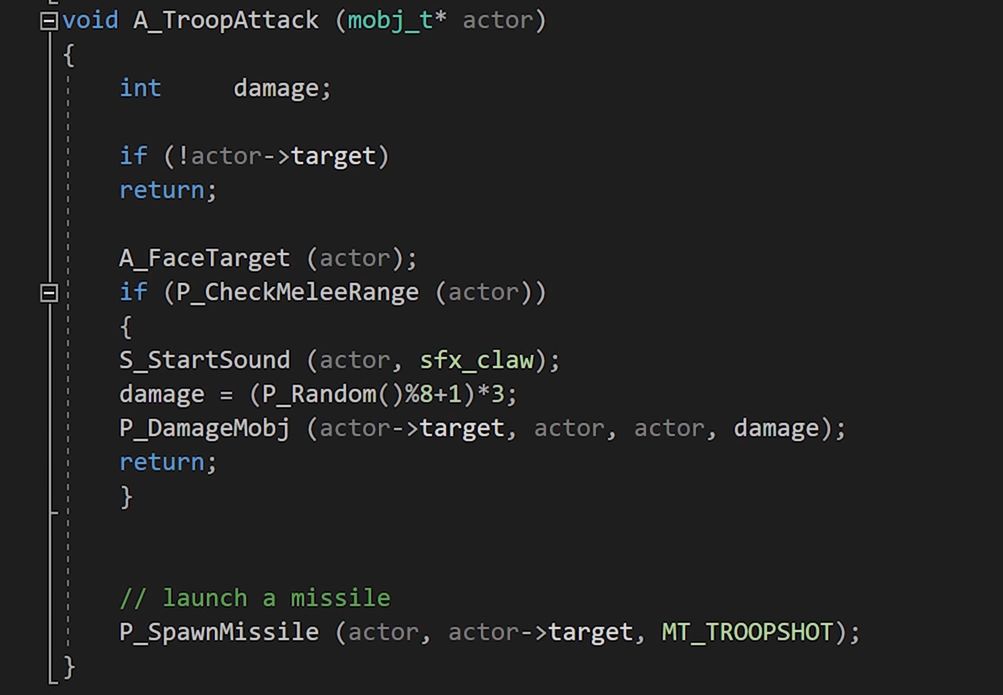 Для выполнения логики любой агент спавнится с прикрепленным объектом thinker. Каждый thinker — это структура на C с указателем на функцию игровой логики, которую враг должен выполнить, а также дополнительные переменные, которые помогают ей обрести форму. Эта функция помогает каждому демону определить нужное поведение по его текущему состоянию.
