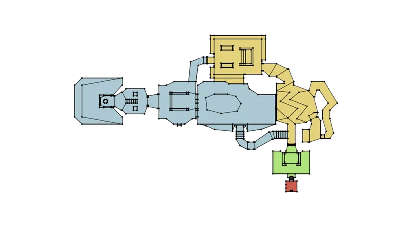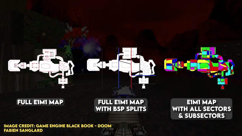 Как сделать, чтобы враг видел игрока и перемещался к нему с наименьшими затратами на просчет пути? Дело в том, что DOOM разбит на фрагменты-секторы с помощью алгоритма двоичного разбиения пространства (BSP, binary space partitioning algorithm). Он позволяет организовать объекты, чтобы те сохраняли пространственную информацию. Так рендерер всегда знает, какие части игровой карты ему нужно отрисовать, отрисовывая только нужный сектор и все примыкающие. Эту оптимизацию добавил Джон Кармак, чтобы повысить производительность рендеринга и не пытаться отрисовать весь уровень.