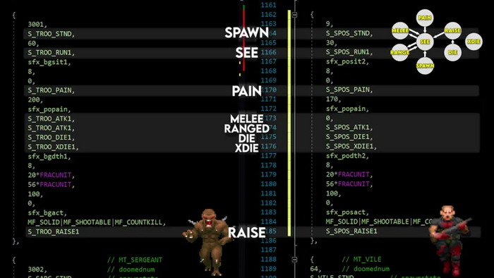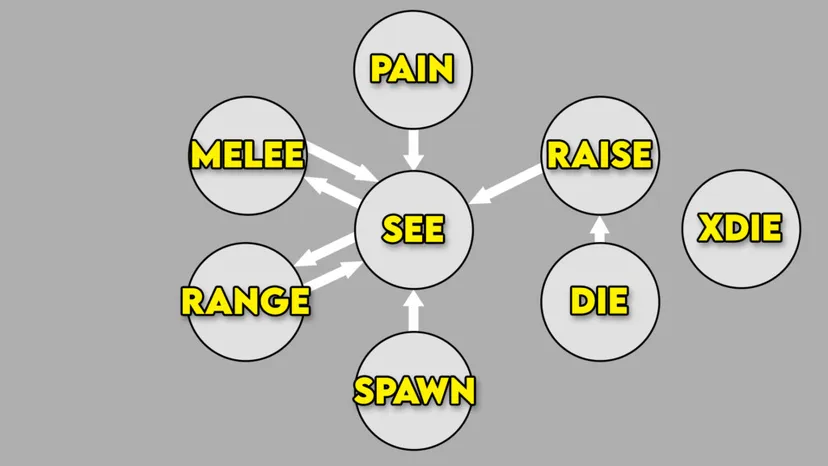 Логика врагов основана на конечном автомате (Finite State Machine) — это простой и эффективный механизм, чтобы определить, выполняет ли персонаж определенное поведение в определенном состоянии, и при каких условиях состояние может смениться. Позже Half-Life популяризировала FSM в шутерах благодаря удобной реализации кодовой базы на C++, а также механизмам, с помощью которых персонажи могут иметь цель и возможность ее выполнить. DOOM работает похожим образом, но ему не хватает некоторых возможностей и бесшовной интеграции — в движке просто нет скриптового языка для гибкой настройки NPC. При этом вся логика написана на C, и в ней реализовано множество хитрых твиков для создания разнообразного дизайна врагов.