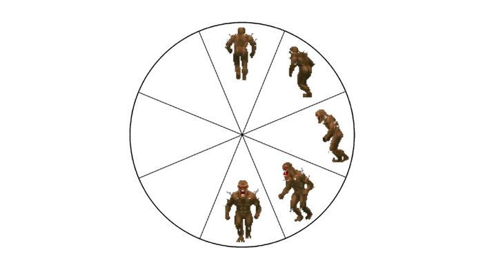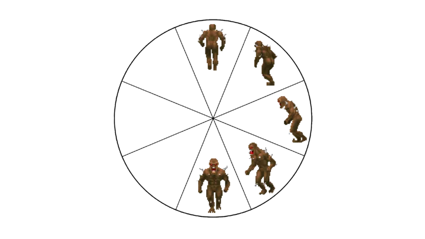 И последнее: для каждого из этих определений действия нужен отдельный кадр анимации, но это скрывает еще одну сложность. Враги в DOOM могут изображаться под 8 различными углами относительно позиции игрока. Поэтому когда используется одно из этих семейств спрайтов, оно всегда извлекает нужный набор спрайтов для этого персонажа, основываясь на его угле относительно игрока.