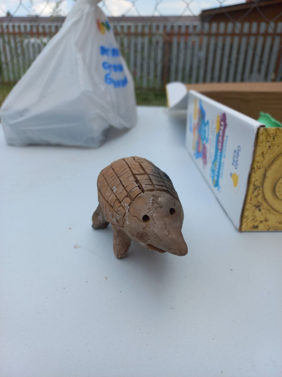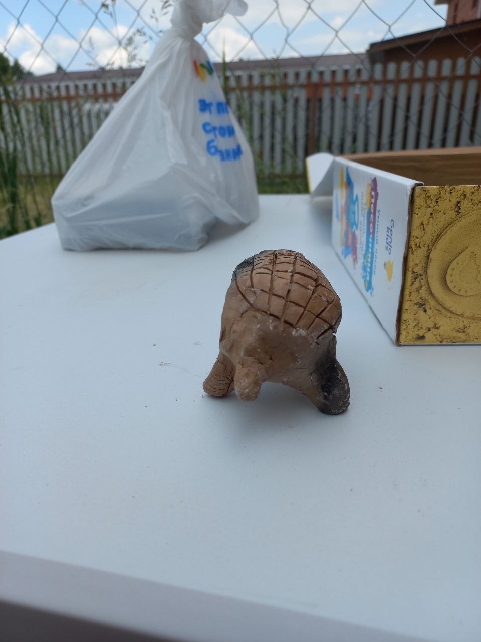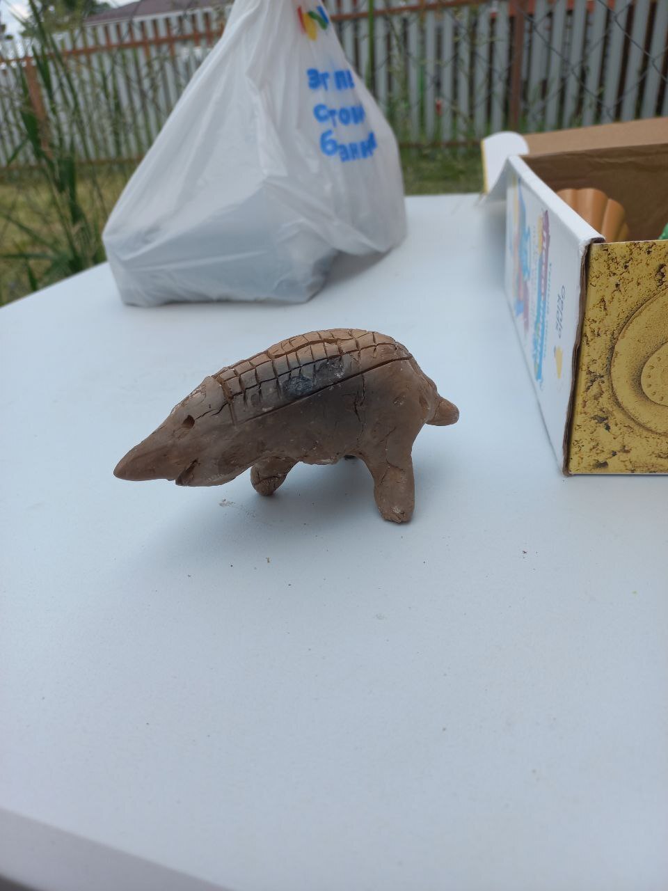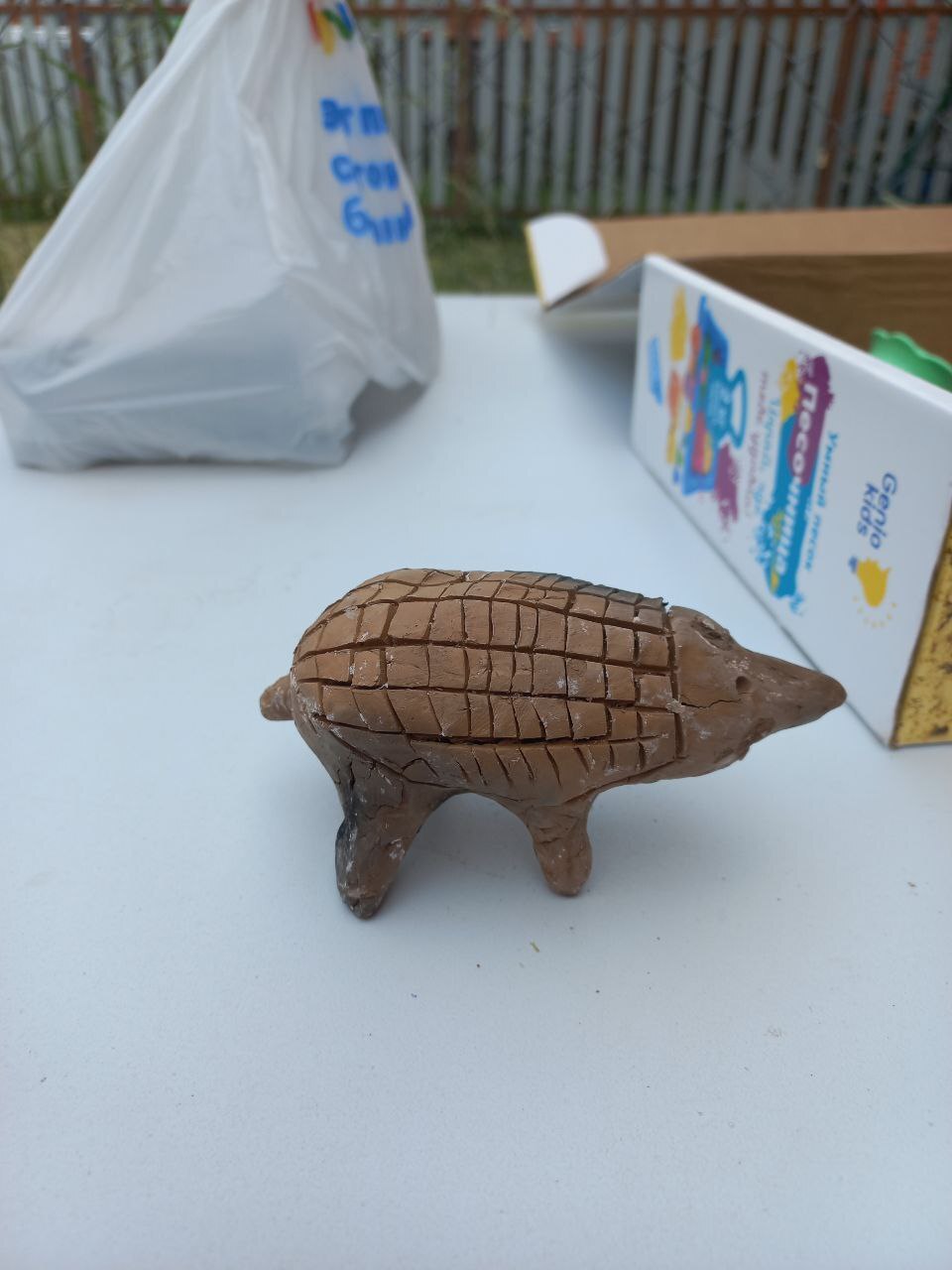 Начал с ёжика. И как то быстро я проникся уважением к древним. Какой красивый он у них получился, такое же страшное чудище получилось у меня. В процессе обжига он ещё потерял ногу. Поставил дома на самое видное место. Жена переставила на самое невидное.