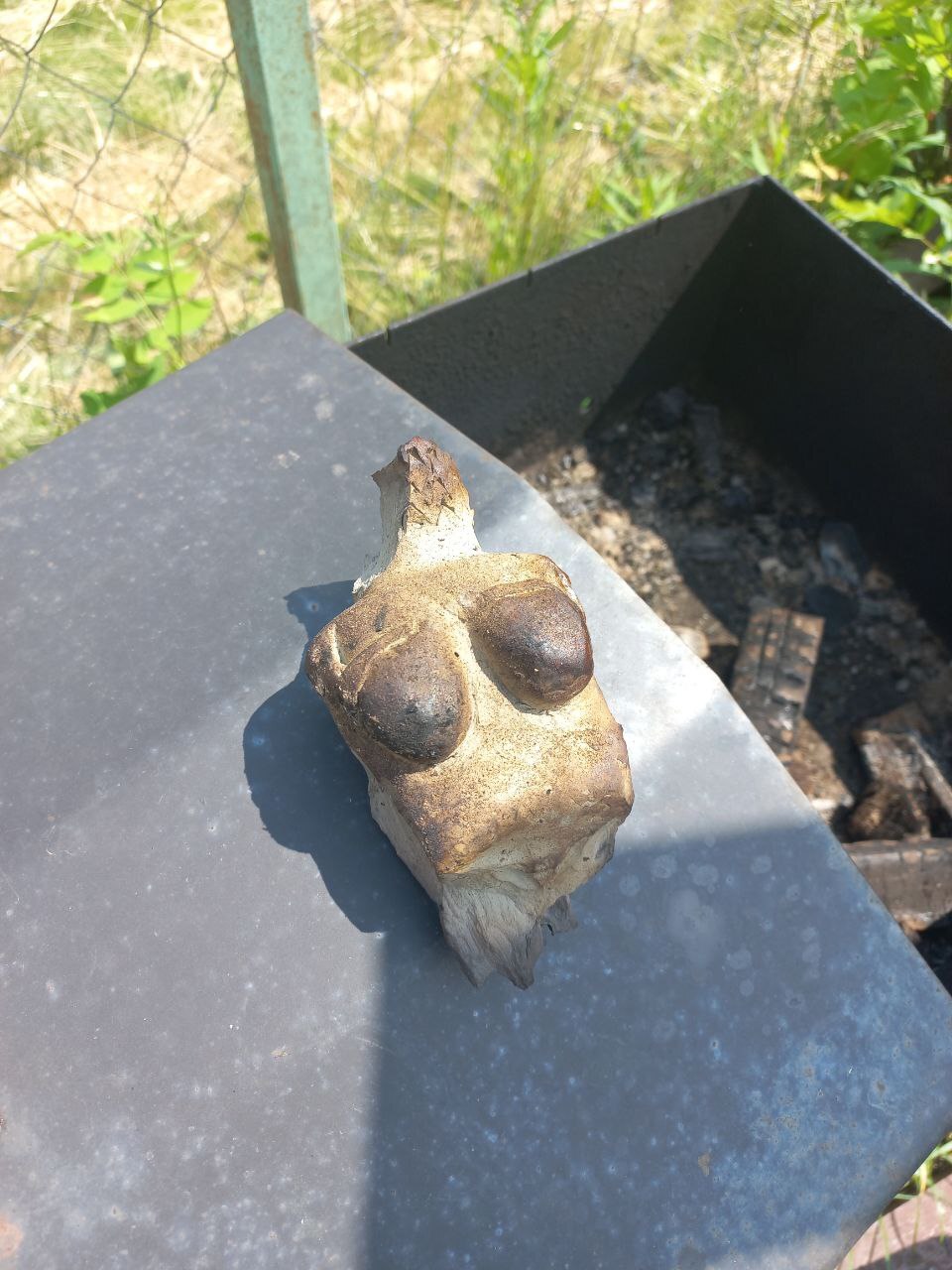 Потом сунул в костёр. И тут стало ясно, что инструкцию надо было прочитать! Она начала взрываться! Бам! Нога улетела метра на три! Бам! Вторая! Бабах! Голова! Зад большой, начал стрелять как пулемет мелкими щепками. Насилу остановил этот кошмар! Но было весело! Видимо какие-то внутренние напряжения у Венеры были, нерешенные проблемы, незакрытые гештальты. Всё что осталось.