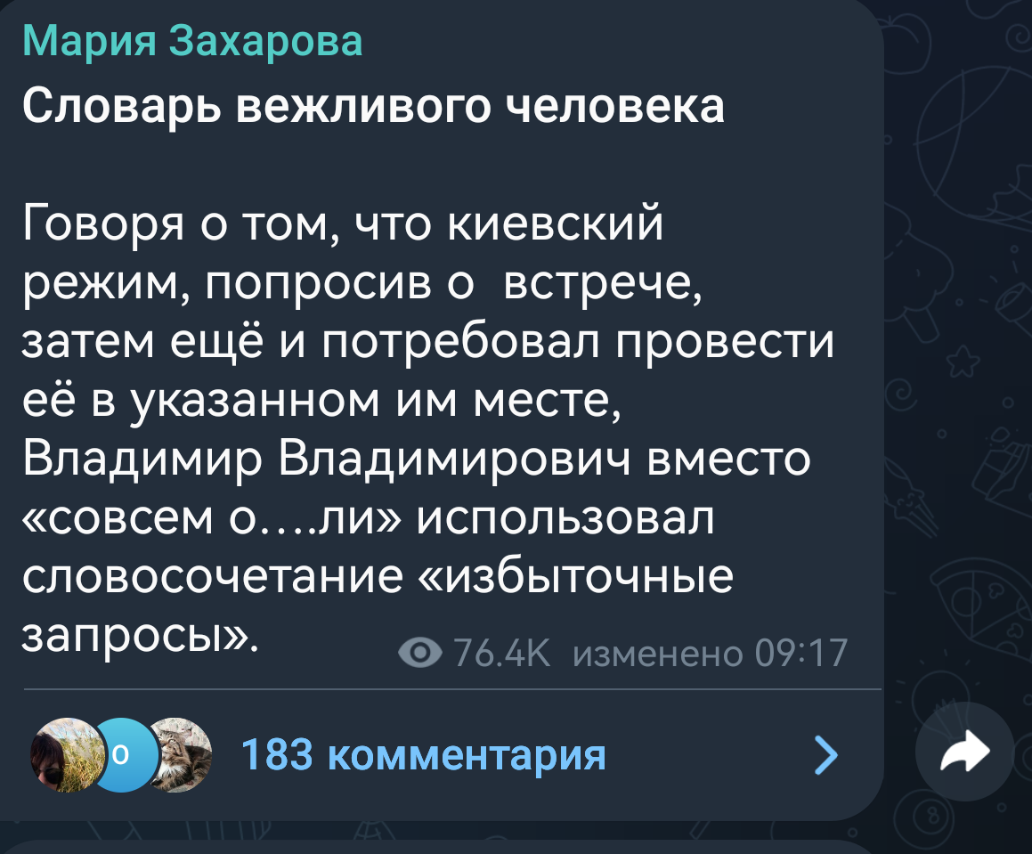 4123 mox3r 2 месяца назад Искусство диалога Источник: Мария Захарова Мария Захарова Политика Юмор Россия и Украина Владимир Путин Владимир Зеленский Встреча Требования Telegram (ссылка) Telegram Скриншот Повтор 534 114 27 7 4 1 Ещё 1