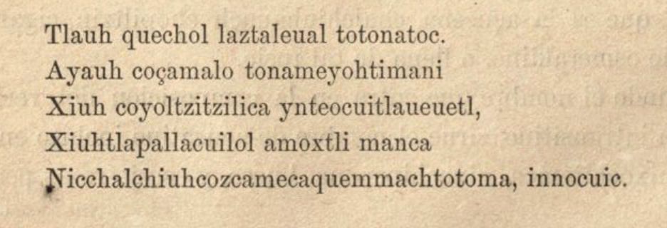 Кроме того, не стоит составлять более ... двух существительных, за исключением редких случаев и когда предложение написано в возвышенном и очень нежном стиле — тогда это следует заимствовать из поэтического языка. Как сказал один из их поэтов [оригинал на науатле на картинке]: