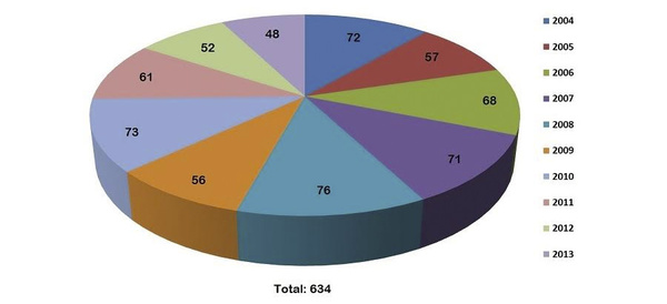 Число убитых женщин с 2004 по 2013 год