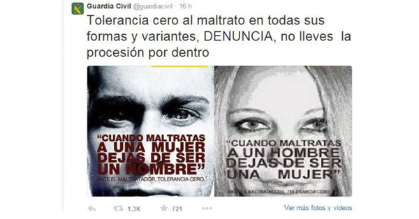 Твит, призывающий и мужчин, и женщин сообщать в полицию о насилии по отношению к себе. Возмутительный факт для испанских феминисток. Текст на правой картинке: «Когда ты жестоко обращаешься с мужчиной, ты перестаешь быть женщиной»