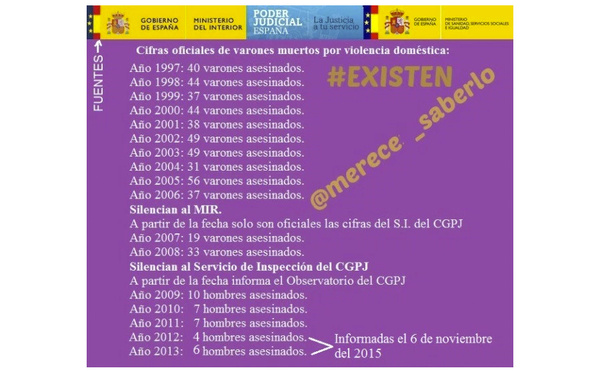 Существуют сотни исследований, показывающих, что домашнее насилие совершается мужчинами и женщинами в примерно равных пропорциях. Существуют и исследования, показывающие, что испанские женщины более агрессивны, чем мужчины. Но факт того, что мужчины являются жертвами домашнего насилия столь же часто, как и женщины, полностью игнорируется медиа, феминистками, правительством и судами.
