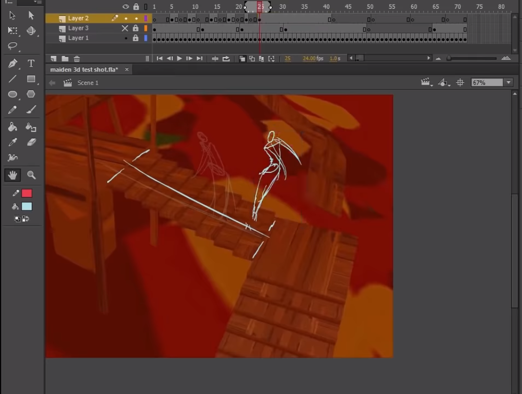 Если в 3D сделано окружение, сложно бывает показать, как 2D-персонаж с ним взаимодействует. В таких случаях окружение и анимацию персонажа делают в разных программах. Потом изображение из одной программы импортируют в другую. Иногда 2D анимацию делают поверх 3D-окружения. Чтобы лучше показать взаимодействие, аниматор на черновом этапе работы намечает в 3D-окружении линии, по которым должен двигаться 2D-персонаж.