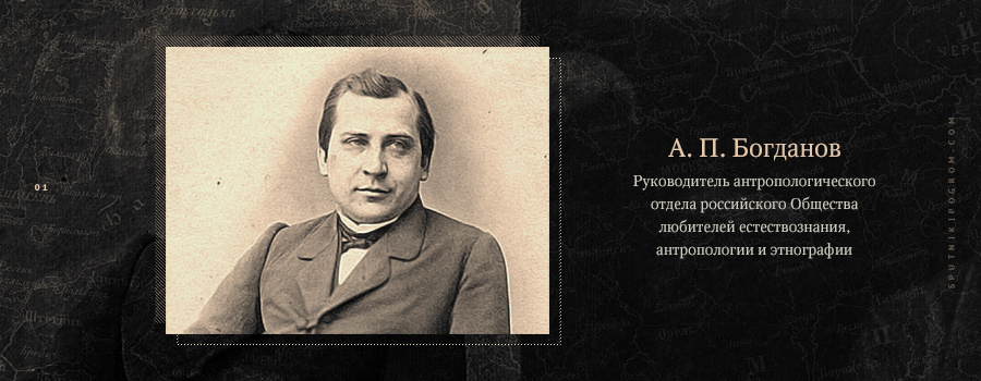 Руководителем антропологического отдела российского общества стал профессор А.П. Богданов. Его перу принадлежит одна из первых научных работ, посвященных антропологии великорусского населения — «Материалы для антропологии курганного периода Московской губернии», — увидевшая свет в 1867 году. Профессор сам проводил раскопки средневековых курганов, собирая материал для своего исследования. Неутомимый ученый, Богданов посетил с лекциями десятки европейских университетов, принял активнейшее участие в организации Этнографической и Антропологической выставок.