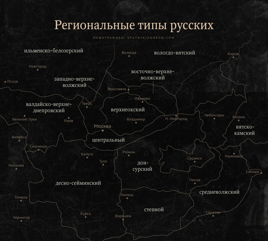 Различия между этими типами не носят принципиального характера, и обнаружить их антропологам удалось лишь обработав огромный материал. Региональные (популяционные) типы обычно не привязаны к конкретному народу, границы популяций в генетике и антропологии часто не совпадают с этническими. Гены не волнуют язык, религия и идентичность. Это будет особенно очевидно дальше, когда речь зайдет об украинцах и белорусах.