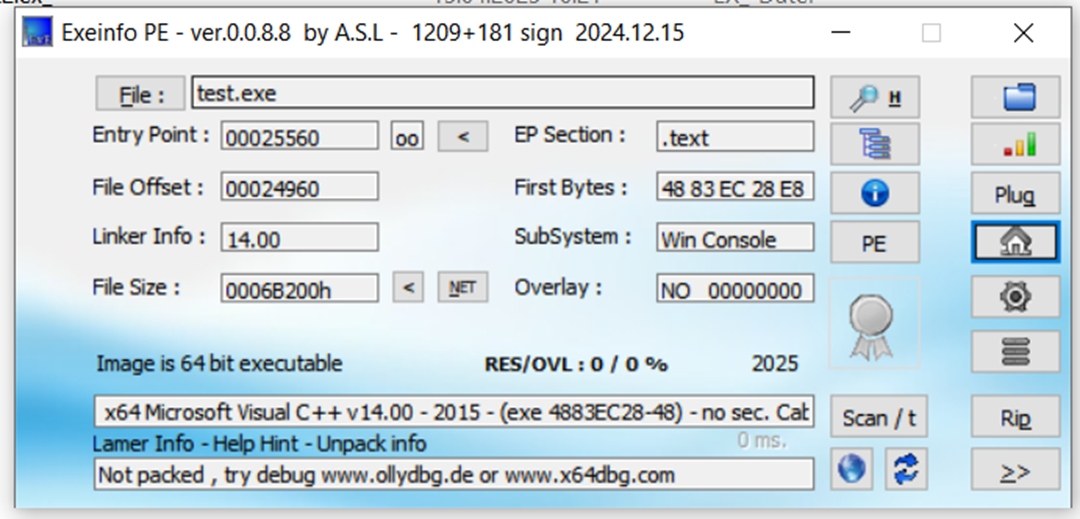 На этот раз скачался исполняемый файл весом в 400 кБ, назовём его test.exe и продолжим