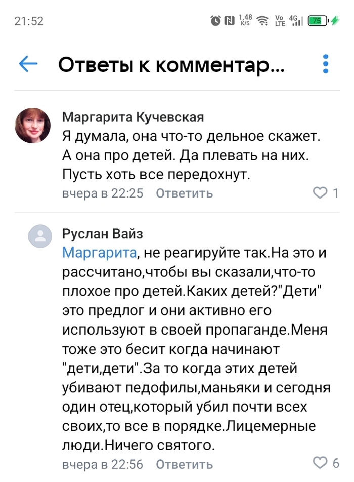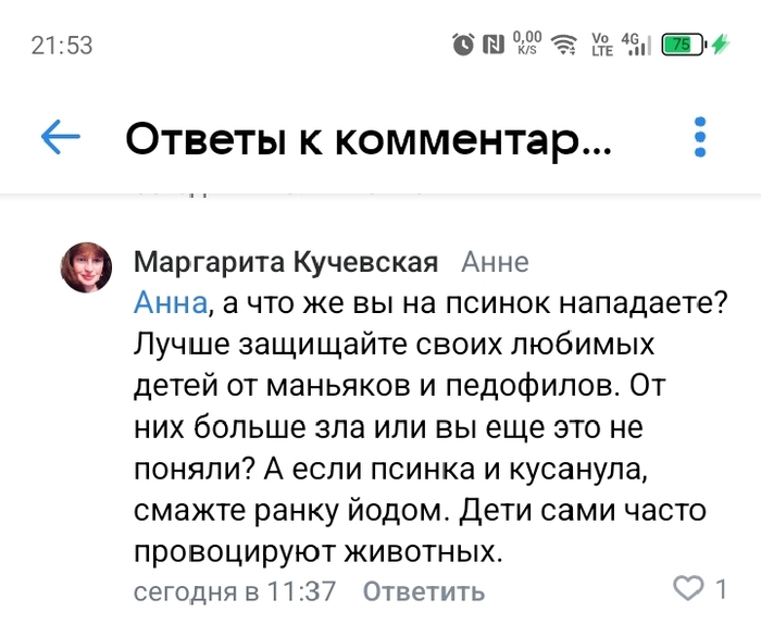 Под очередным постом Останиной вылезло это! На детей ей плевать, пусть хоть все передохнут, но за псинок она горой! Да и Руслан этот под каждым постом Останиной свои пять копеек вставляет, а грозит то как, аж да напишет кому-то, да как привлекут комментатора! Херой комнатный) Страшные люди!
