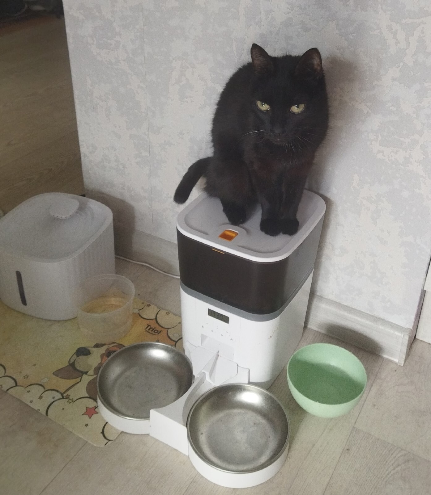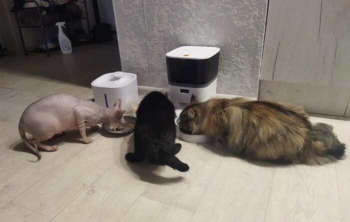 Когда я переехала, я взяла голую-Алису и купила им автокормушку, потому что нужно было не допускать ожирения пушистой-Алисы из-за угрозы проблем с сердцем, а лысой-Алисе просто надо было набрать вес (она была очень худая, кода я ее взяла) и держать на уровне. Я видела жирных сфинксов в интернете, мне не понравилось. Теперь Алисы едят по расписанию сухой Renal корм, для почек.