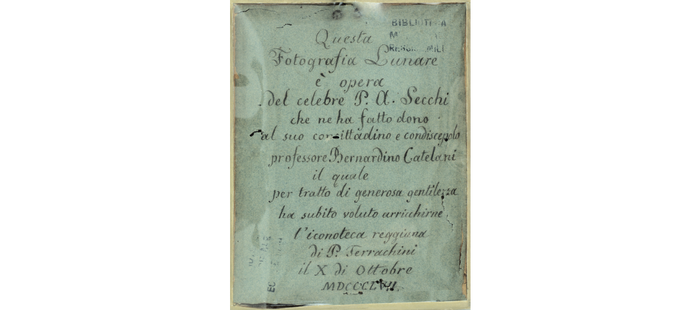 Фотографии Луны, изображенные здесь, были найдены среди рукописей Наборре Кампанини из Библиотеки Паницци: они оформлены в рамку, а на обороте есть дата и рукописная заметка (рис. 1). Сохраненные в Фототеке фотографии свидетельствуют о серии, сделанной Анджело Секки совместно с римским фармацевтом Франческо Барелли в 1857 году.