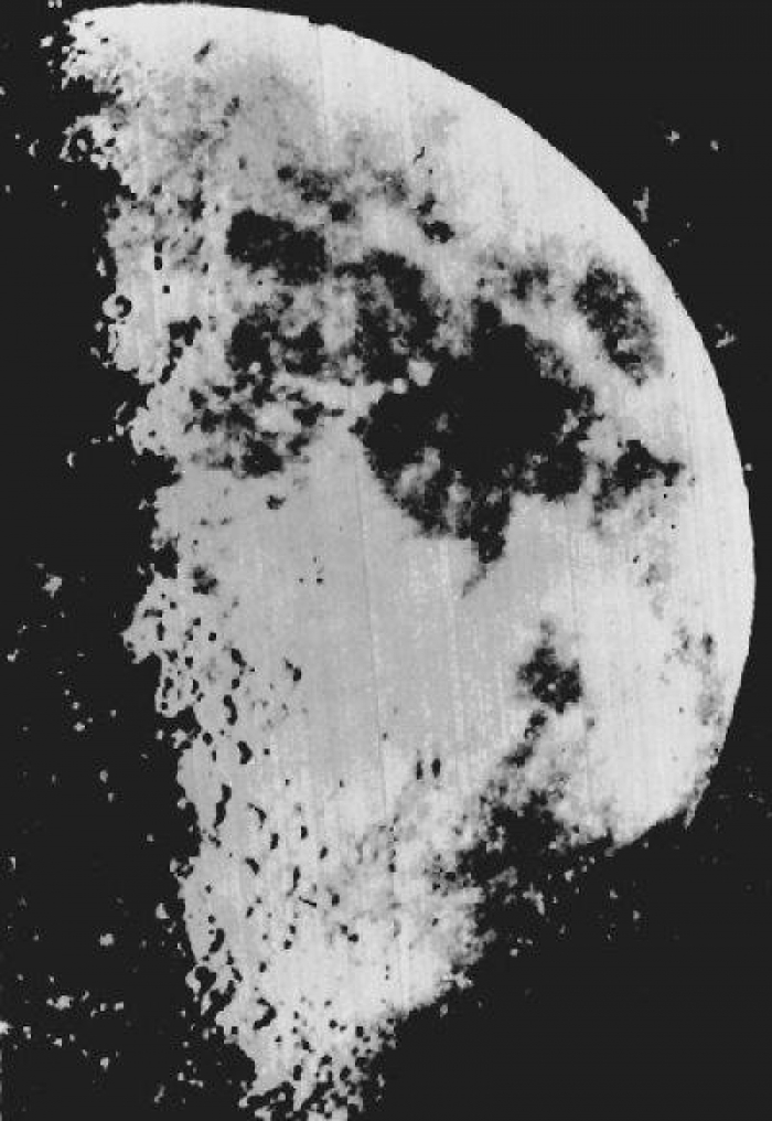 Первый неудачный дагерротип луны, полученный Дагерром. Его изображение было очень размытым, вследствие необходимости длительной выдержки. До появления электронных монтировок с системой наведения оставалось 150 лет.