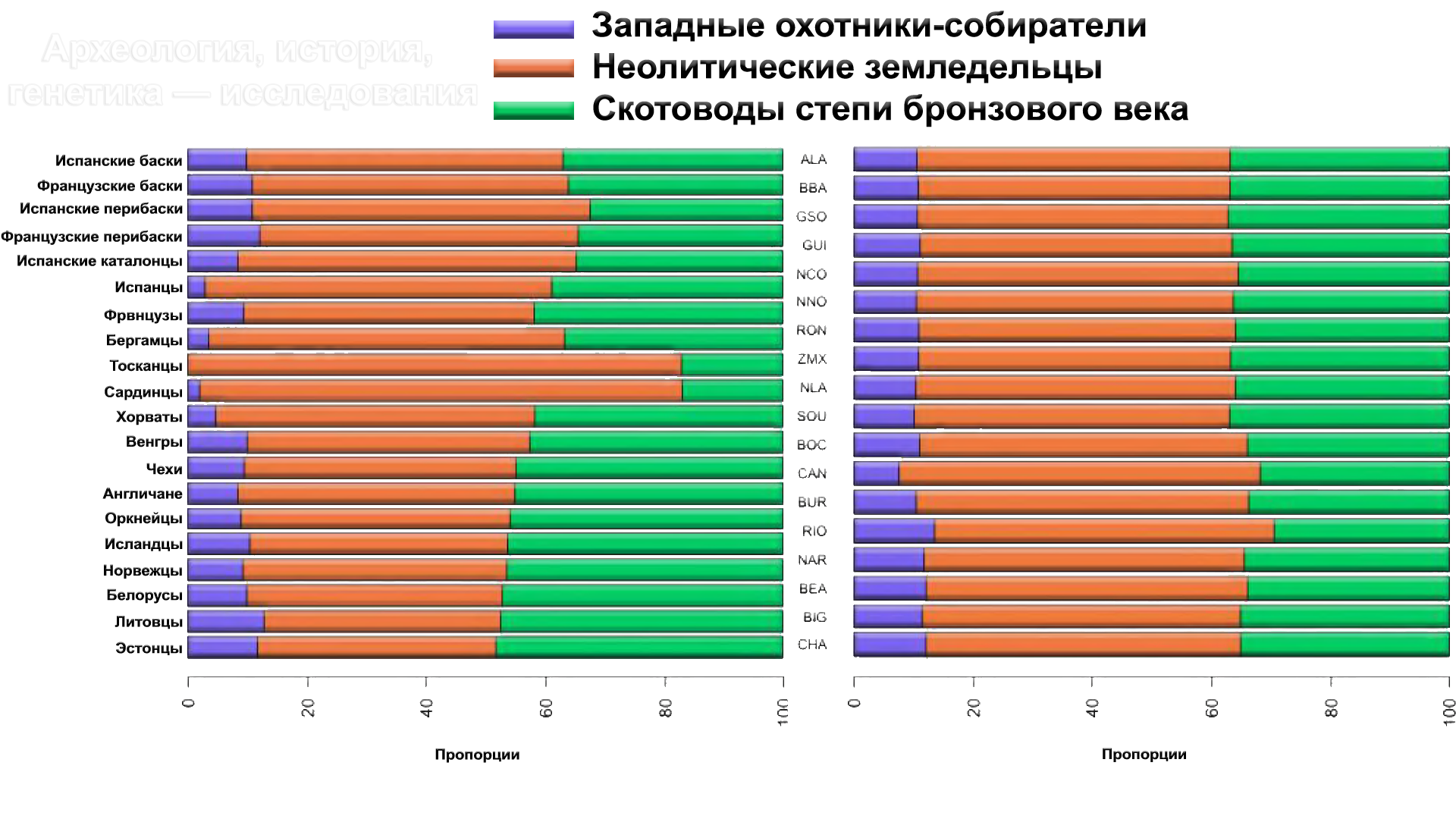 А анализ примесей показал, что у басков и перибасков, по сравнению с другими европейскими популяциями, было меньше компонентов, связанных с Левантом и Ираном неолита, совместно с более высокой долей анатолийских или ранних европейских земледельцев.