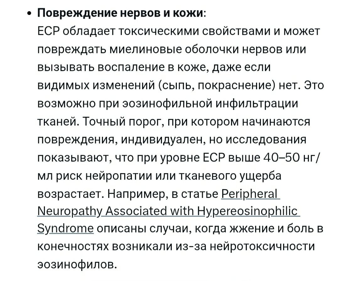 Злился на врачей, на ОМС, на себя. А потом появился искусственный интеллект. Я начал копать через нейросети, нашел людей с похожими симптомами. Оказалось, мой эозинофильный белок, который под 50, может жечь нервы и ткани. Я сам сдал эти анализы, не врачи. Аллерголог потом сказала: У тебя есть какая-то реакция на летние растение -райграсс. Но почему у тебя симптомы 12 месяцев, аллергия не объясняет. Это другое состояние. Так и сказала, что у вас какое-то эозенофильное воспаление. Аллергия у вас только летом, а симптомы 12 месяцев. Ищите у ревматолога и гематолога. похоже на лейкемоидную эозинофильную реакцию». Может, гиперэозинофильный синдром? Васкулит? Это дало надежду - лечение есть, хоть мне его пока не дают.Но в ОМС всё тот же кошмар. Ждешь врача две недели, а он: «Иди к другому». Нетипичные случаи? «Не к нам». Я злюсь, кричу внутри: «Почему вы не хотите разбираться?!» Бывает, падаю духом, чувствую пустоту, как будто всё бессмысленно. Но потом где-то внутри загорается искра. Не знаю, откуда она, но я встаю. Коплю на платные анализы, читаю про эозинофилию, ищу врачей. Верю, что найду ответ, даже если сил и моральных и физических иногда не много.