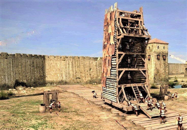 На первом этаже располагался таран, выше метательные орудия, а на самом верху лучники и метатели копий, чей задачей было сбивать противника со стен и препятствовать поджогу самой башни. Между башнями была устроена галерея защищавшая солдат. Были начаты два подкопа под стены, на этом же участке. Кроме этого город был окружен, чем то вроде окопов, для предотвращения вылазок гарнизона. Имея ввиду возможность деблокады города этолийской армией, Филипп возвел защитные сооружения и с внешней стороны. По римской терминологии это были циркумвалационная и контрвалационная линии. Как видите, действительно, все очень всерьёз.