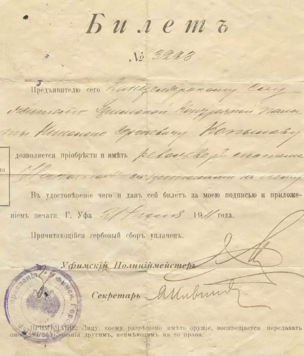 Чтобы легально приобрести нарезное оружие или револьвер, нужно было подать прошение в полицию или губернатору, объясняя причины владения, например, для охраны имущества. Однако итоговое решение зависело от мнения местных властей — в одних губерниях разрешения выдавались охотно, в других — получали отказ без объяснений.
