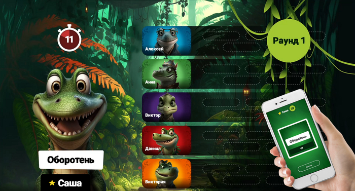 Для того, чтобы играть в нашего «крокодила» понадобятся телефоны, подключённые через QR-код к Anroid TV или компьютеру, компания готовых на всё друзей с хорошим настроением и недюжинными актёрскими способностями, помогающими набирать игровые баллы.