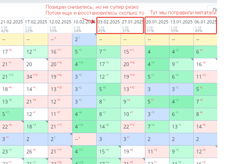 Тем не менее позиции в Яндексе поползли вниз — стали разбираться. До того как это начало происходить мы в рамках SEO редактировали мета-теги.