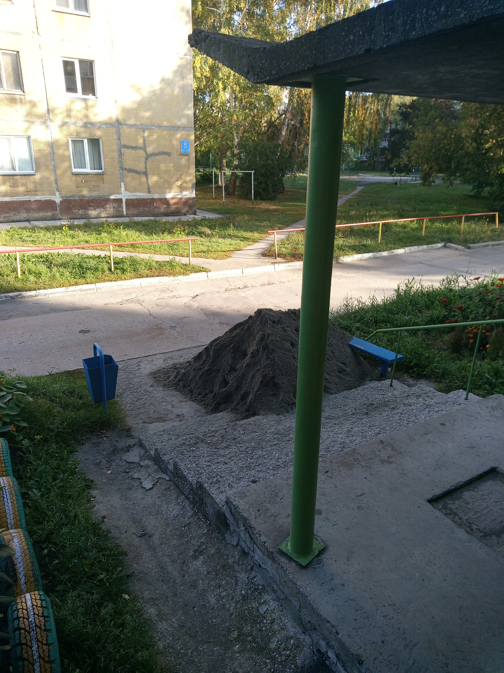 Кому-то подбрасывают котят, кому-то кабачки, нам к подъезду подбросили кучу песка. На мой взгляд куча возникла сама собой, материализовавшись к вечеру из ниоткуда. Очевидцы в лице окрестных пенсионеров, делая круглые глаза и рыболовные жесты руками, рассказывали эпос о возникшем из небытия грузовичке, который долго прицеливался и сотворил гору. Ясно было только одно - это забота о жителях, которые никогда не должны подскальзываться даже на зелёном газоне и лавочке, которые тоже попали под раздачу.