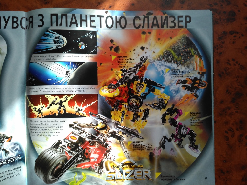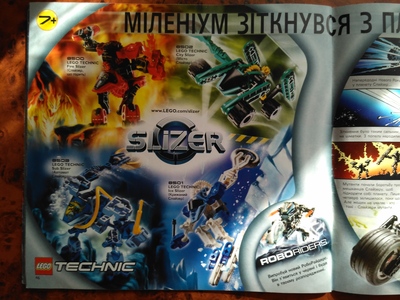 В серии был сюжет про планету поделённую на зоны вроде зоны джунглей или зоны города, в каждой из них обитал свой робот слайзер. Сюжет там довольно упоротый про какой-то вирус, добрых и злых слайзеров, судью и ещё всякое. Нам он не особо интересен. Интерес вызываю новые детали, а все наборы кишат ими. Это и головы роботов, их туловища, руки и ноги крепятся с помощью нового вида соединений Ball Joints (шаровые соединения которые туго вращаются). Для усиления притока денег от серии в продаже появились наборы с боевыми "фризби" разных цветов. В комплекте с каждым роботом было 2-3 фризби и нефиговый намёк в инструкции, что всего таких дисков куда больше и вообще "собери их все!".
