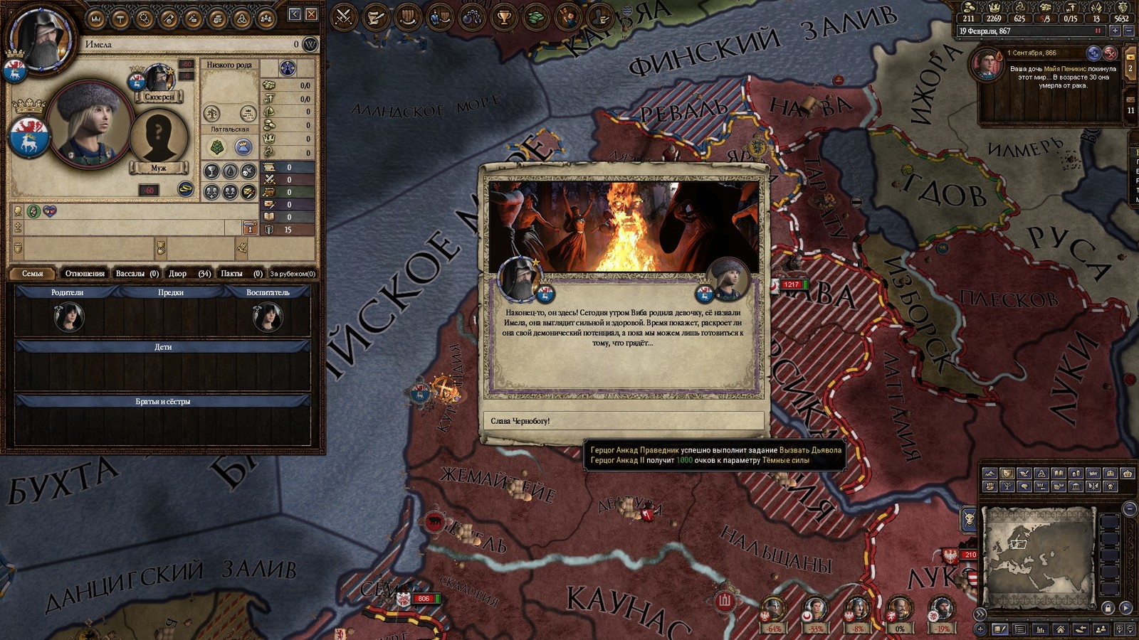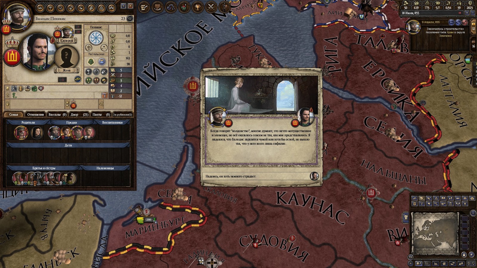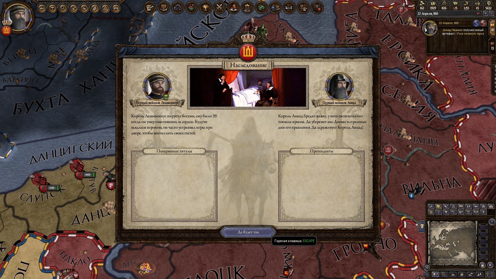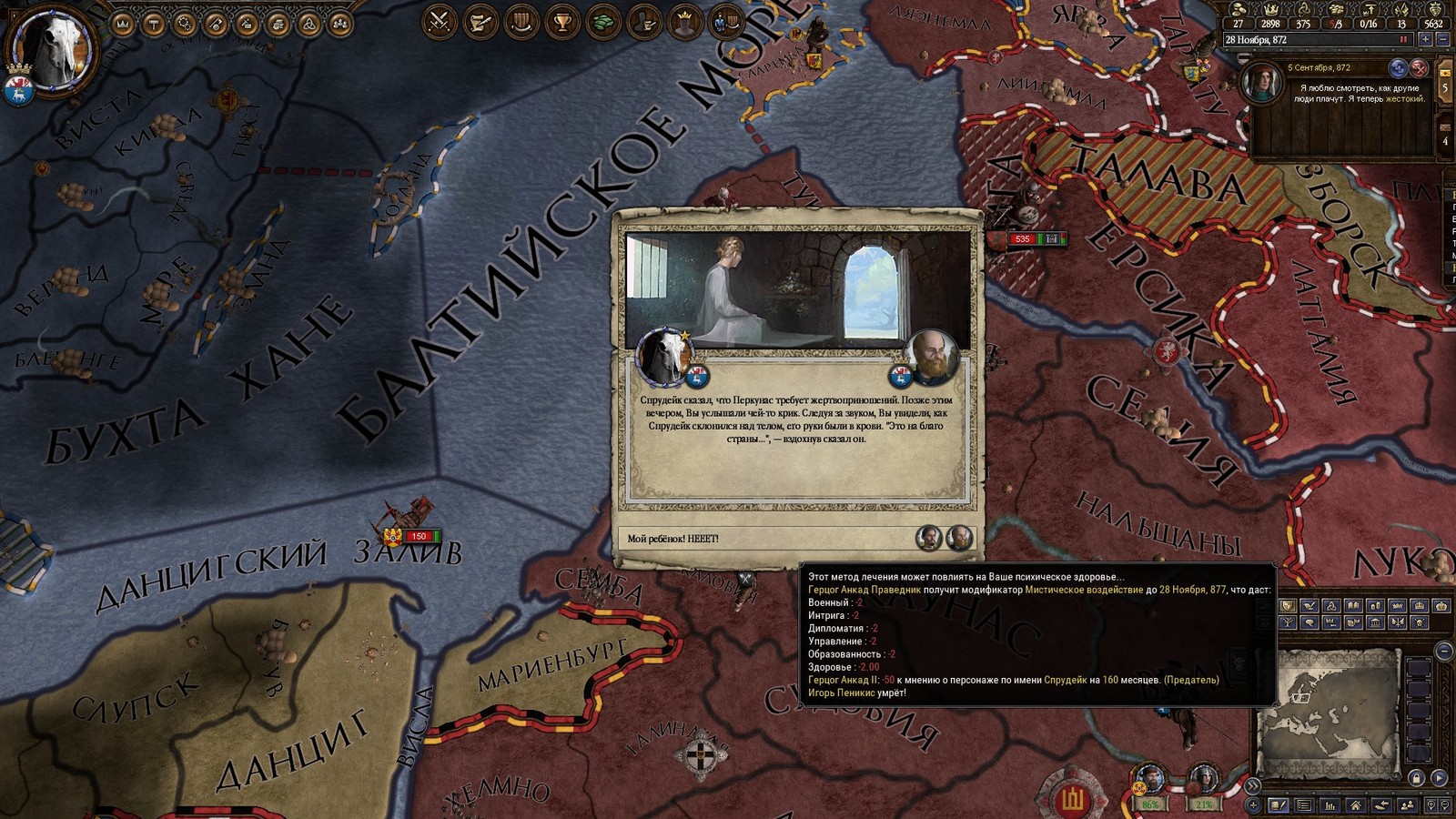 Пока старейшины плели заговоры против друг друга, Скурдо пытался вылечить придворный врач, который дважды спасал жизнь его деду, но безуспешно. Тогда Скурдо обратился за помощью к высшим силам, которые тоже не пожелали даровать исцеление юному королю. Борьба старейшин достигла пика: каждый пытался пропихнуть своего кандидата после грядущей смерти Скурдо, каждый день выдавалось новое решение совета. Затем недовольные старейшины стали убивать друг друга, пока не остался в живых самый старый и хитрожопый, который умер от сердечного приступа на своей любовнице (скрин к сожалению не сделал :), для этой ситуации нужен трейт похотливый и преклонный возраст, тогда может появится событие, в результате которого с шансом 10% наступит такая смерть). Совет старейшин полностью обновился и выбрал наследником Ламмекинуса - внука Дзинтиса от другого сына, того самого, который зарубил его на дуэли.