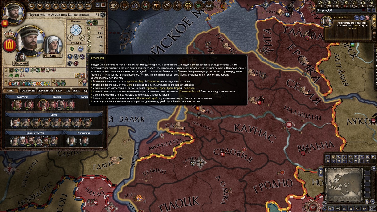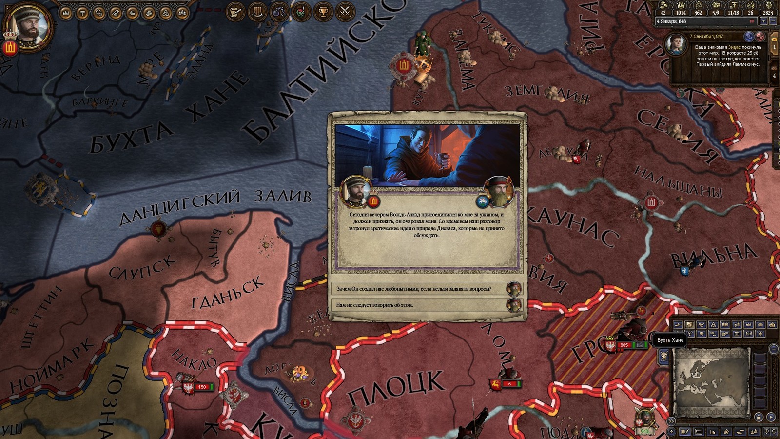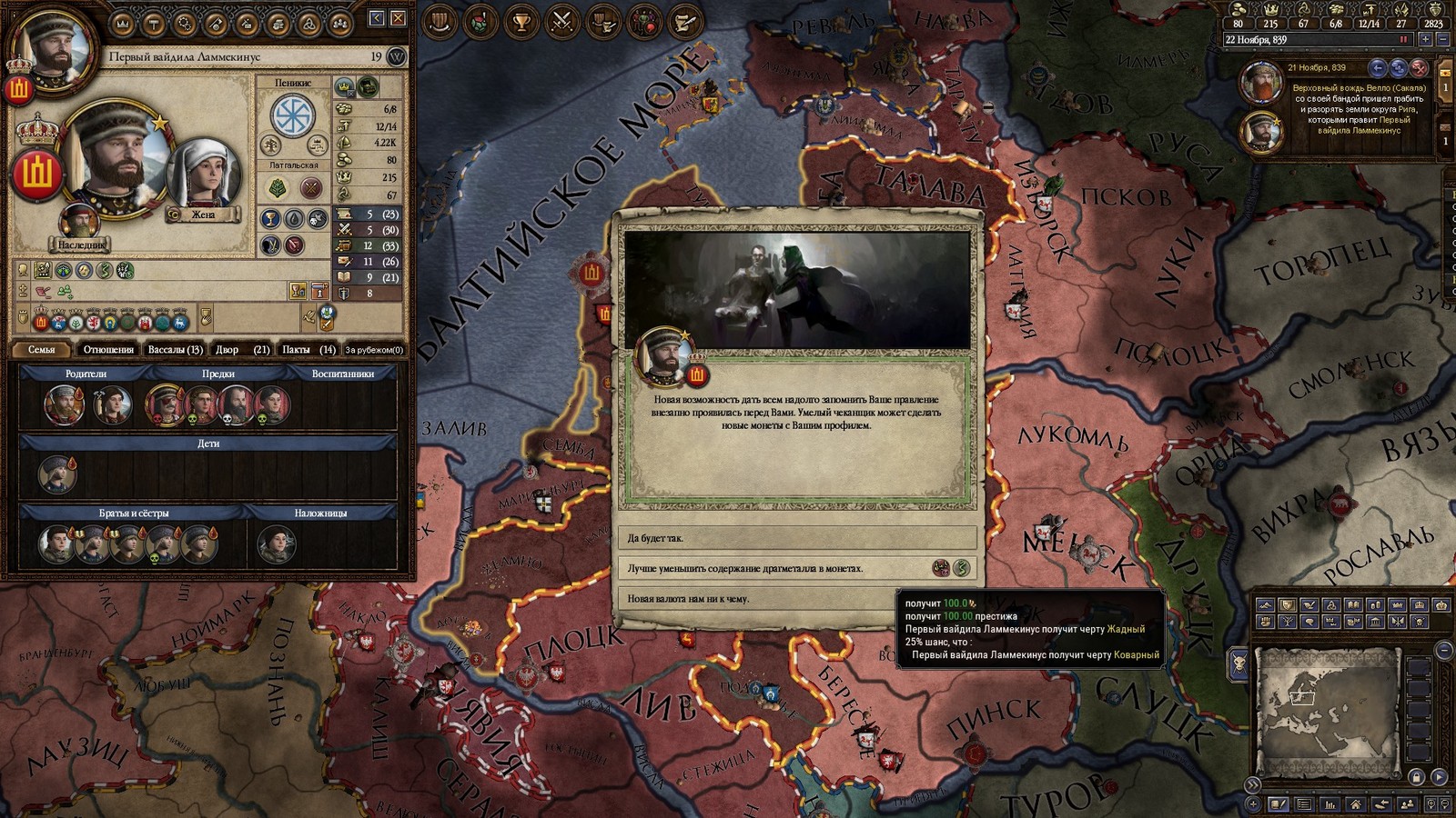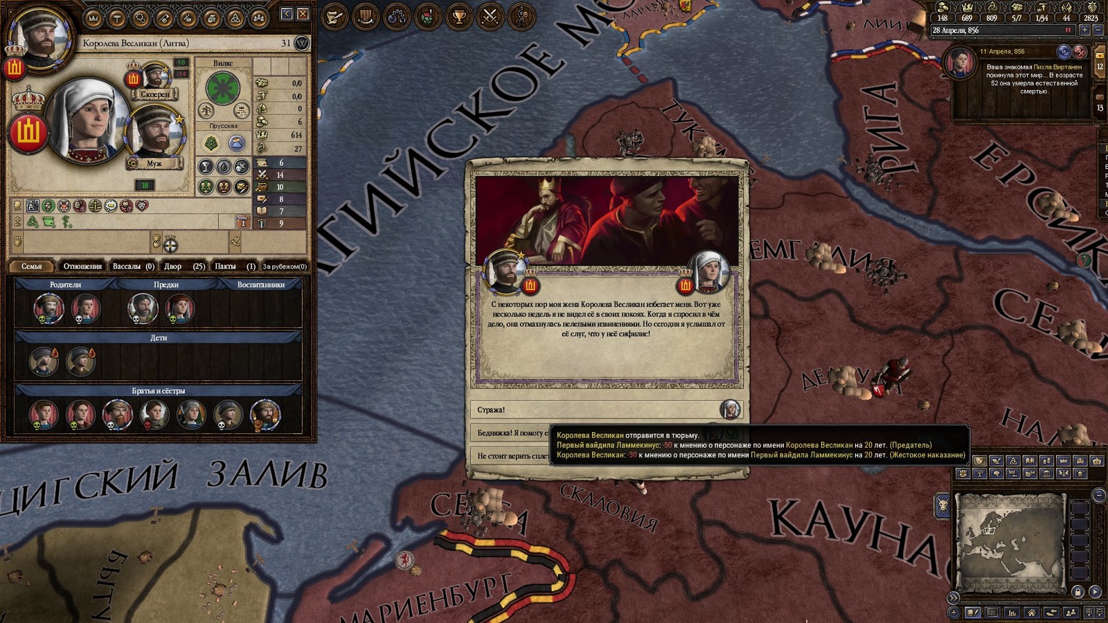 Пока старейшины плели заговоры против друг друга, Скурдо пытался вылечить придворный врач, который дважды спасал жизнь его деду, но безуспешно. Тогда Скурдо обратился за помощью к высшим силам, которые тоже не пожелали даровать исцеление юному королю. Борьба старейшин достигла пика: каждый пытался пропихнуть своего кандидата после грядущей смерти Скурдо, каждый день выдавалось новое решение совета. Затем недовольные старейшины стали убивать друг друга, пока не остался в живых самый старый и хитрожопый, который умер от сердечного приступа на своей любовнице (скрин к сожалению не сделал :), для этой ситуации нужен трейт похотливый и преклонный возраст, тогда может появится событие, в результате которого с шансом 10% наступит такая смерть). Совет старейшин полностью обновился и выбрал наследником Ламмекинуса - внука Дзинтиса от другого сына, того самого, который зарубил его на дуэли.