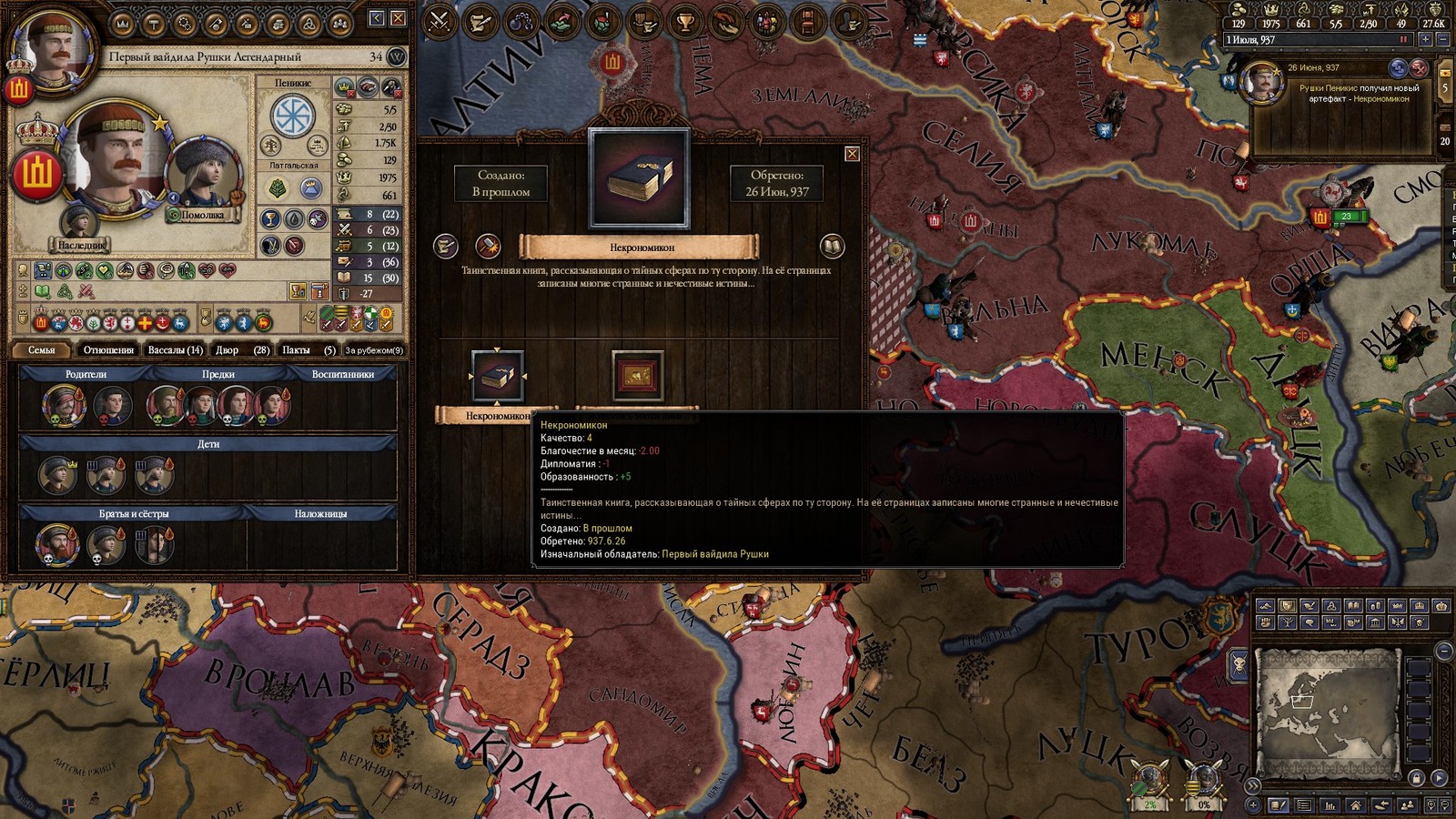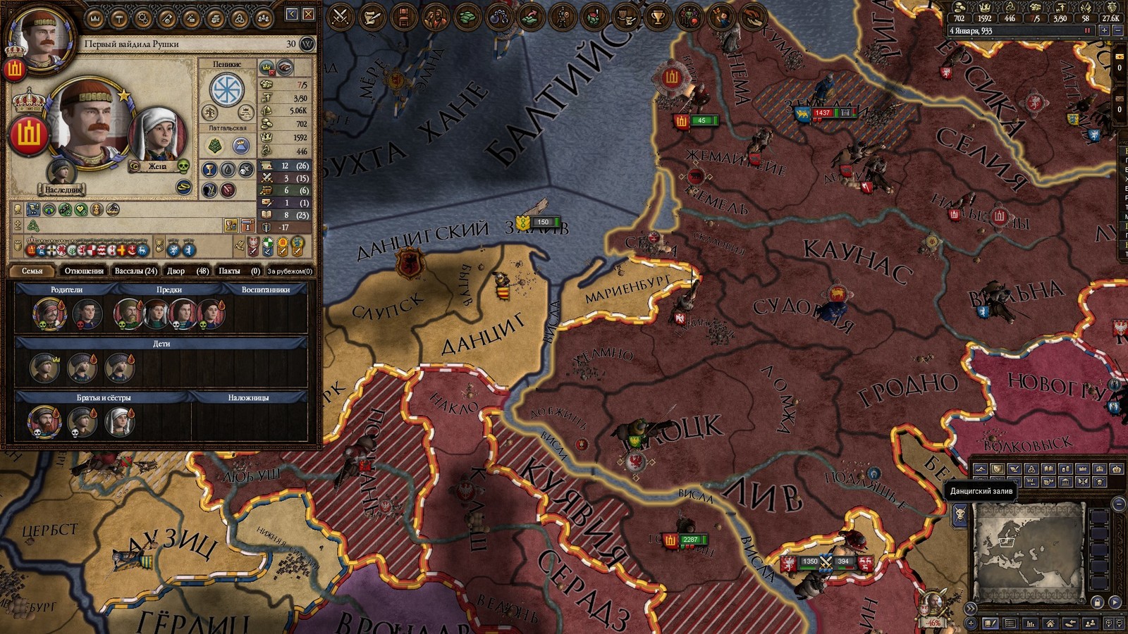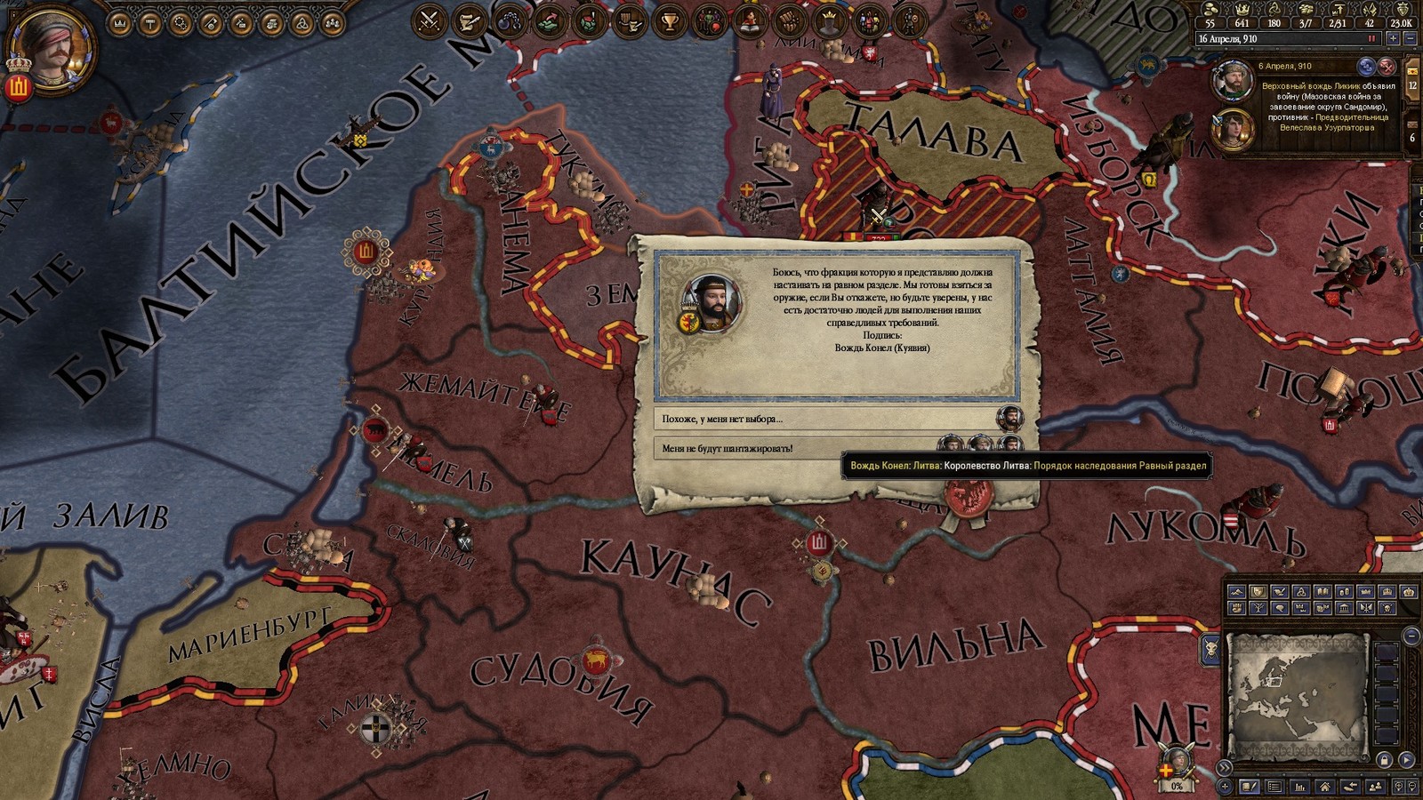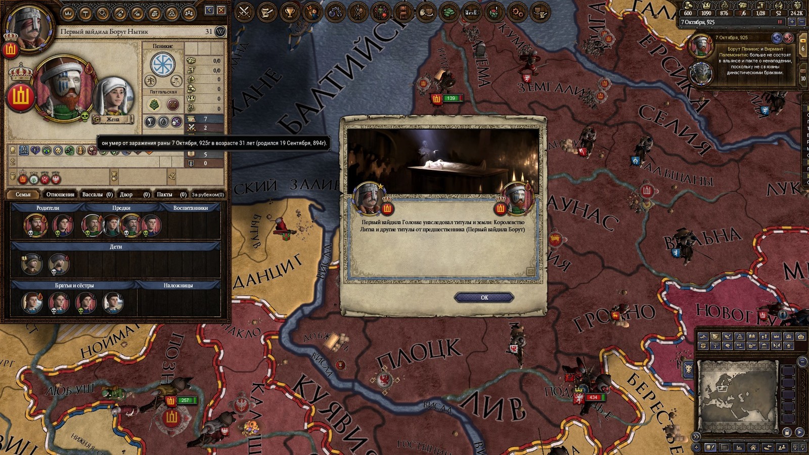 В третий раз Головке взошел на престол и сразу приступил к экспроприации короны Диеваса (вообще не так много способов отжать артефакт у кого-то, я выбрал следующий: сделать вождя Гродно своим прямым вассалом, не оставить у него наследников и умертвить). Но корона пока что осталась у своего владельца, так как Головке решил умереть от рака в самый не подходящий момент. Есть и плюсы - сын всего один, так что все титулы отойдут ему, да еще и бонусный титул Прусского герцога (когда Головке был королем первый раз, основные титулы отошли старшему сыну, а младшему отошло графство в Пруссии. За время правления Головке предприимчивый сынок отжал и герцогский титул).
