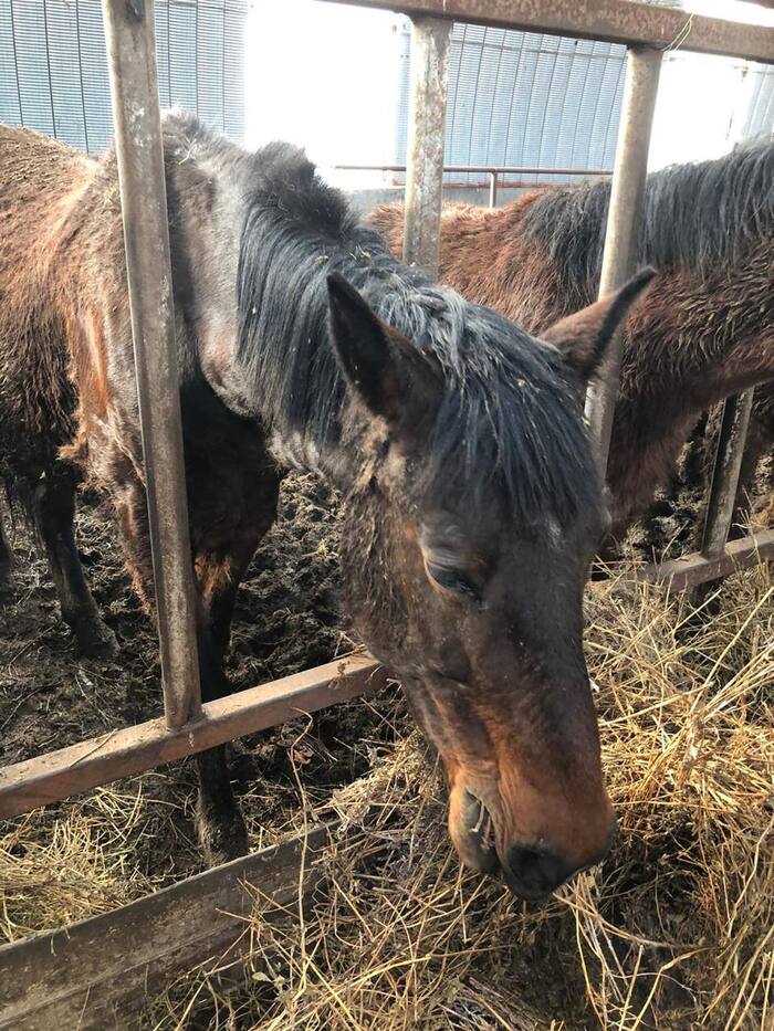 Я расспросила всех знакомых конников, никто не знал про эту конюшню. Поехали на угад, спустя долгое время дороги стало ясно что видимо это очередная пустая наводка, обратно решили ехать другой дорогой и вот река, мост, а за ней постройка и … гуляют лошади. Сразу же завернули туда, зашли на территорию, гуляют тяжики. Подхожу к конюху, спрашиваю про Попадью, он звонит не знаю такую, звонит директору и дирекутор говорит что да, есть такая, командует конюху показать нам лошадь по кличке Попандопала. С замиранием сердца я захожу в ангар, там стоят лошадь в жиже навоза, все грязные и облезлые, многие из них худые, не дожидаясь показа конюха я вижу уткнувшуюся в солому мою "По". Она была в ужасном состоянии, но это была она. Подхожу к ней, а у неё взгляд замученной убитой лошади, просто в никуда, на предложенную ей морковку набросилась.