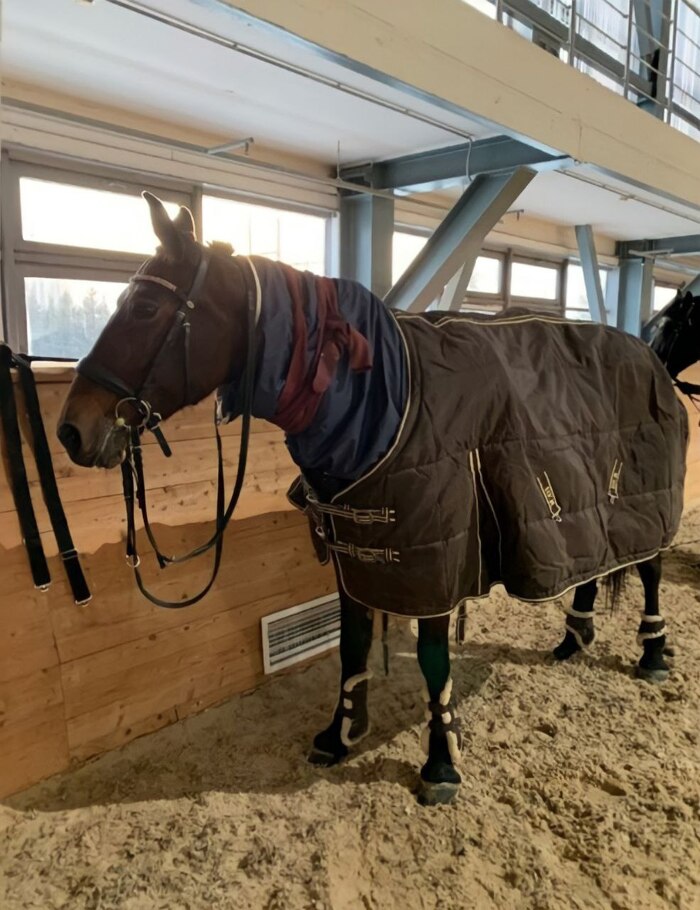 Ну, например, после работы, особенно в холодное время года, ее укутывают в попону и шарфик, чтобы Попадья не простудилась. В каждой конюшне по 2 два солярия, в которых лошадок подсушивают, моют, если были получены растяжения, то втирают согревающий крем, заворачивают в попону и отправляют в денник. В чистый денник, который уже убран, постелены свежие опилки и заботливо уложено сено. Не знаю даже стоит ли говорить, что у лошадей есть еще и личный массажист, парикмахер и почесушник, которые делают каждую мордочку особенно счастливой)