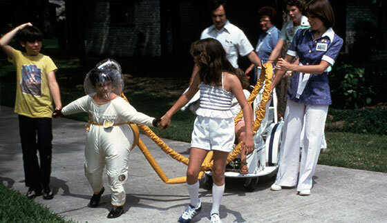 В один прекрасный день история Дэвида Веттера, «мальчика из пузыря», долетела и до сотрудников NASA, которые были тронуты ею до глубины души. И, конечно же, им захотелось тоже как-то поучаствовать в жизни Дэвида, и в 1977 году сотрудники NASA, основываясь на опыте изготовления космической амуниции, создали специальный скафандр стоимостью 50 000 долларов США, который позволял Дэвиду выходить из своего кокона во внешний мир.