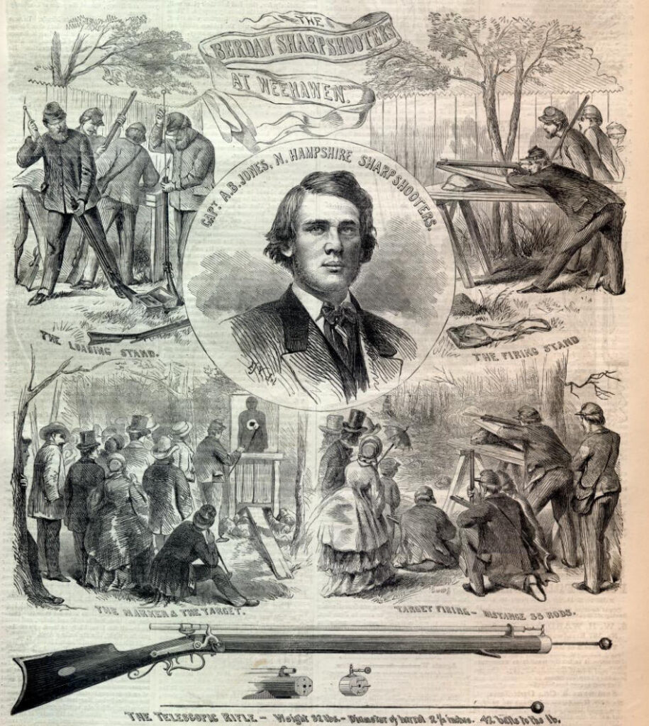 В центре капитан Джонс, на иллюстрациях этапы отбора в подразделение Бердана. Газета «Harper’s Weekly» от 5 октября 1861. Внизу иллюстрации изображена матчевая винтовка с оптическим прицелом и насадкой "false-muzzle".