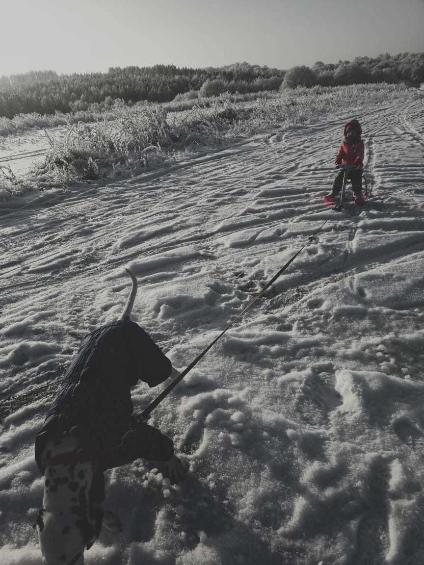 Ну и конечно с наступлением снега, он отлично показал себя в лыжных походах и прогулках только не забывать одевать его в теплый комбез.