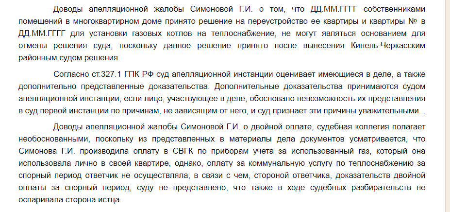 В июле 2017г. ООО Жилкомсервис в лице Трубач Н.К. подали в суд на жителей поселка, установивших котлы и водонагреватели. Но все они закончились одинаково – нас обязали выплачивать.