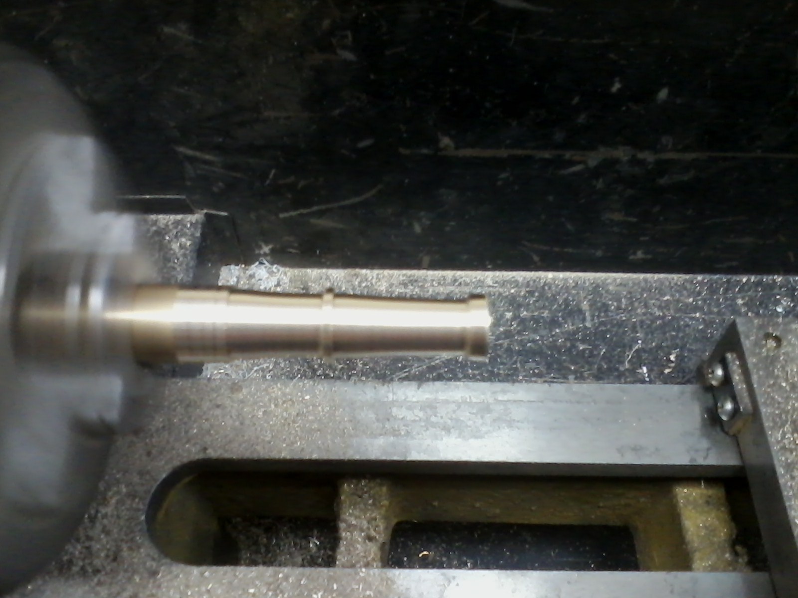 Начал я с того, что взял пруток то ли бронзы, то ли латуни, скорее всего первое, т. к. стружка подозрительно легко ломалась, и пошел к токарному станку. На фото я сделал приблизительные наметки того, что хочу получить.