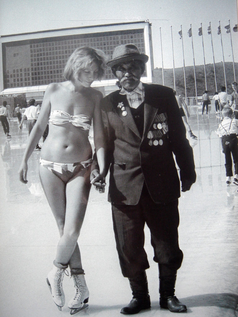 Олег Иванов фотограф Алматы Казахстан МедеоВ конце 80-х годов каток «Медео» был любимым тусовочным местом: туда возили туристов, там проводила выходные молодежь и всегда можно было увидеть кучу знакомых. Я в тот день на катке встретил свою коллегу Алену Островскую, молодую журналистку, с которой мы вместе работали в газете «Дружные ребята», яркую, красивую, веселую. День был солнечный, Аленка каталась в купальнике – а чего бы не позагорать, раз погода позволяет. Я присел на скамейку перезарядить пленку в фотоаппарате, Алена остановилась рядом поболтать. Рядом на скамейке сидела целая делегация сельчан, видимо, передовиков, награжденных поездкой в столицу. Коньков у них не было, они просто пришли на «Медео» поглазеть на достопримечательность. «А давайте я вас вместе сфотографирую», – предложил я самому почтенному колхознику. Больше всего в искусстве я ценю юмор, и сразу увидел, какой кадр наклевывается. Аксакал тут же согласился и вышел на лед, прямо в сапогах с калошами. К счастью, церберы, которые гоняли со льда всех, кто в обуви, были далеко и не заметили нашей фотосессии. Дедок с удовольствием приобнял Аленку, она нежно к нему склонилась, а все спутники аксакала одобрительно поржали. В целях экономии фотопленки я сделал один-единственный кадр – тогда в фотолаборатории издательства ЦК Компартии Казахстана с нас строго спрашивали за перерасход материалов. Алена покатила дальше, деда односельчане увели продолжать экскурсию.