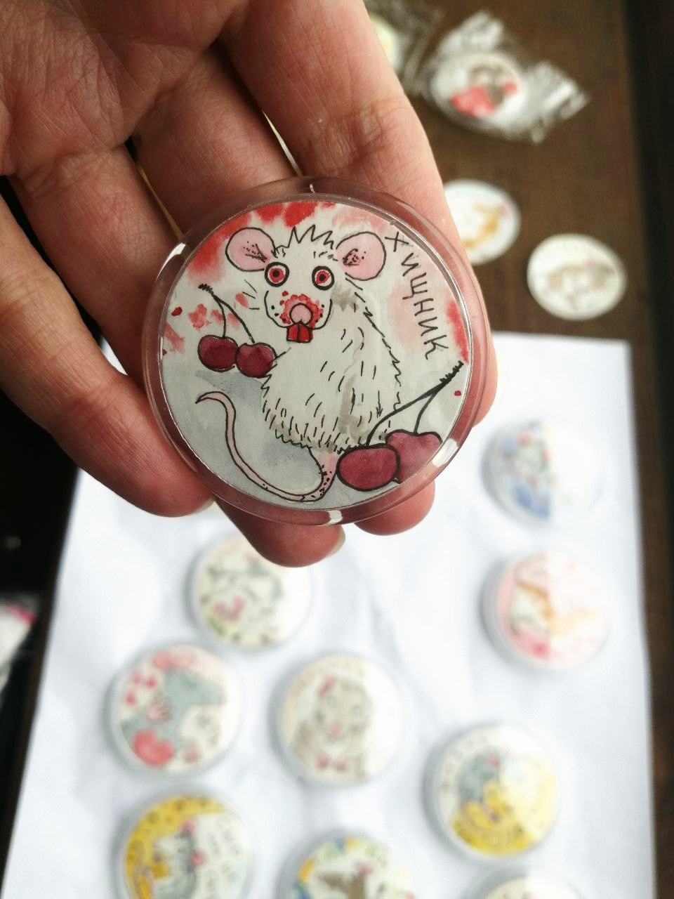 Это серия значков. Акварель, линер на бумаге в акриловой заготовке. Размер значка 44 мм
